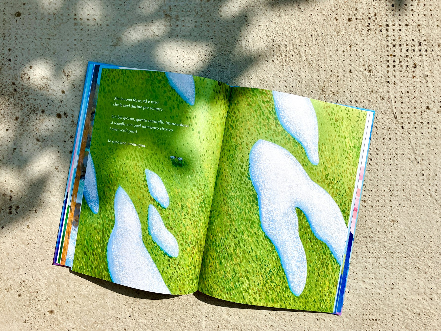 Aprendo e sfogliando il libro, si nota da subito che le tavole illustrate da Célina Guiné occupano sempre le due pagine: colorate q.b., zero tinte piatte, assolutamente immersive. A volte sembrano acquerelli, altre volte sembra di vedere il sogno dei pastelli colorati e poi ci sono forme che sembrano disegnate digitalmente. Quello che è certo è che il mix di stili dona alle montagne un’immagine onirica eppure contemporanea. In Io sono un montagna, le illustrazioni hanno l’importante compito di raccontare visivamente il testo del racconto, talvolta attraverso dei close-up su prati e pendii, altre volte con una visione d’insieme della montagna. Una cosa che ho notato e che mi è piaciuta è che in quasi tutte le tavole c’è la presenza di un umano o di un animale, quasi a riportare allo sguardo del lettore il nostro essere piccoli di fronte alla grandezza della montagna e degli eventi mostrati; questo però non per evidenziare il nostro essere limitati, ma il come possiamo (e dobbiamo!) prendere esempio dalla resilienza della montagna, tematica che è il filo conduttore del libro. Se si legge l’albo insieme ai più piccoli, poi, trovare animali e persone all’interno delle tavole illustrate potrebbe diventare un gioco, un pretesto narrativo interessante. Il testo non è molto e risulta distribuito in maniera armonica, in accordo con le illustrazioni e la suddivisione per paragrafi scandisce il ritmo delle lettura. Per quanto riguarda la tipografia interna, per i paragrafi di testo è stato utilizzato sempre lo stesso font serif, dalla grazie appuntite ma che da ampio respiro alla lettura.