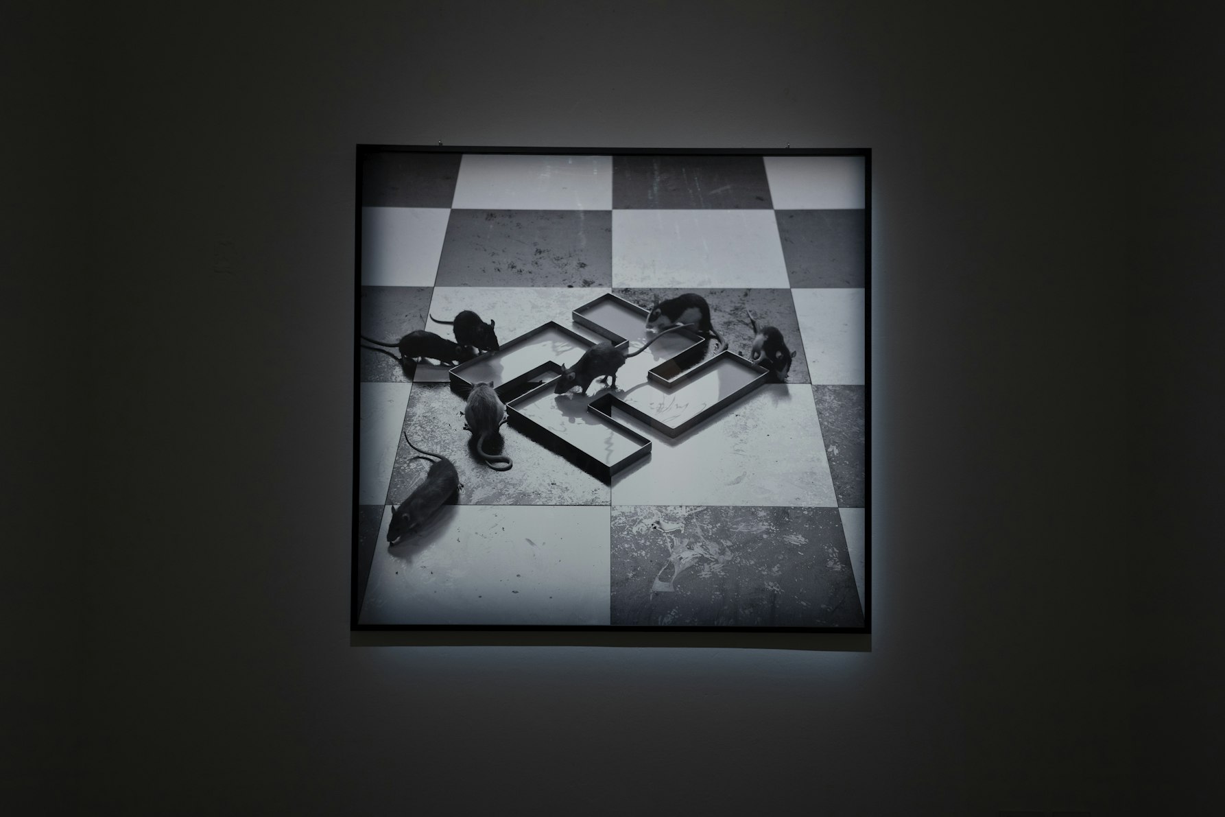 Impattante e di tutt’altro segno la fotografia di Santiago Sierra L’abbeveratoio, che si rifà a una performance che metteva in scena diversi elementi a partire dal video girato in parte al Tempio Karni Mata in Deshnoke in Rajasthan, dove i topi sono considerati sacri, e in parte a Centrale Fies (2015), in cui su un pavimento a scacchi bianchi e neri una svastica fungeva da abbeveratoio per la moltitudine di topi che, sotto lo sguardo di alcuni spettatori, attingevano al latte messo a loro disposizione. Una svastica piena di latte per gli animali sacri, latte associato a innocenza e purezza, la svastica come simbolo antichissimo e di buon auspicio, di cui il Nazifascismo si è appropriato legandolo a una della pagine più oscure dell’Europa del’900, mutandone profondamente il senso, invertendone totalmente il segno. Di simile impatto L’Angolo del saluto di Giovanni Morbin: un prisma a base triangolare il cui vertice più alto è costituito da una lama di acciaio inox, diventa una riflessione sul gesto -non solo performativo- ma su un gesto in particolare, quello del saluto fasci- sta, di cui la lama riproduce la perfetta angolazione del braccio teso al saluto, definita dall’artista “quasi uno stampo per un’azione da compiere”. L’opera rimanda ai meccanismi di rappresentazione che contribuivano ad una estetizzazione della vita politica del ventennio, rendendo materica e scultorea la forza offensiva di un gesto e ragionando su come questo gesto fosse adesione al progetto politico del fascismo. Alcune delle opere di Collezione Fies sono invece tracce di ciò che è avvenuto, ma sono capaci di riempire lo spazio con una vita e narrazione propria. Ma in Collezione Fies è presente anche presente ANAGOOR, con una scansione in 3d di una statua classica, raffigurante Apollo, in un’operazione di “raccolta di una realtà lunga 2500 anni, come il frontone del tempio di Zeus a Olimpia”, per darne una nuova identità digitale. Le opere di Curt Steckel e Filippo Minelli, che nascono per essere traccia, sono state creata all’interno di unseen perfomance, ossia performance agite in assenza di pubblico: la prima una scultura costruita poco prima del momento dell’entrata del pubblico in sala, che si ritrova a viverne le tracce, gli odori e l’energia di quello che è successo un attimo prima, e vendendone gli esiti e non il suo svolgersi; la seconda una fotografia che ferma l’atto performativo nella sua traccia finale. «L’idea di Collezione Fies ha origine nel 2014, grazie a un dialogo con l’artista Francesca Grilli che faceva parte del progetto Fies Factory, il primo incubatore italiano per artisti performativi under 30, nato nei primi anni 2000 sempre qui, a Centrale Fies. Inizialmente Collezione nasce da una domanda che ha sempre messo in crisi chi lavora nell’ambito del performativo, ossia sul come documentare la performance, come tenerne traccia. Immaginare degli elementi documentativi al di là della fotografia e del video, delle interviste, dei libri, sembrava al tempo una sfida decisamente interessante. Ma con non poche criticità: