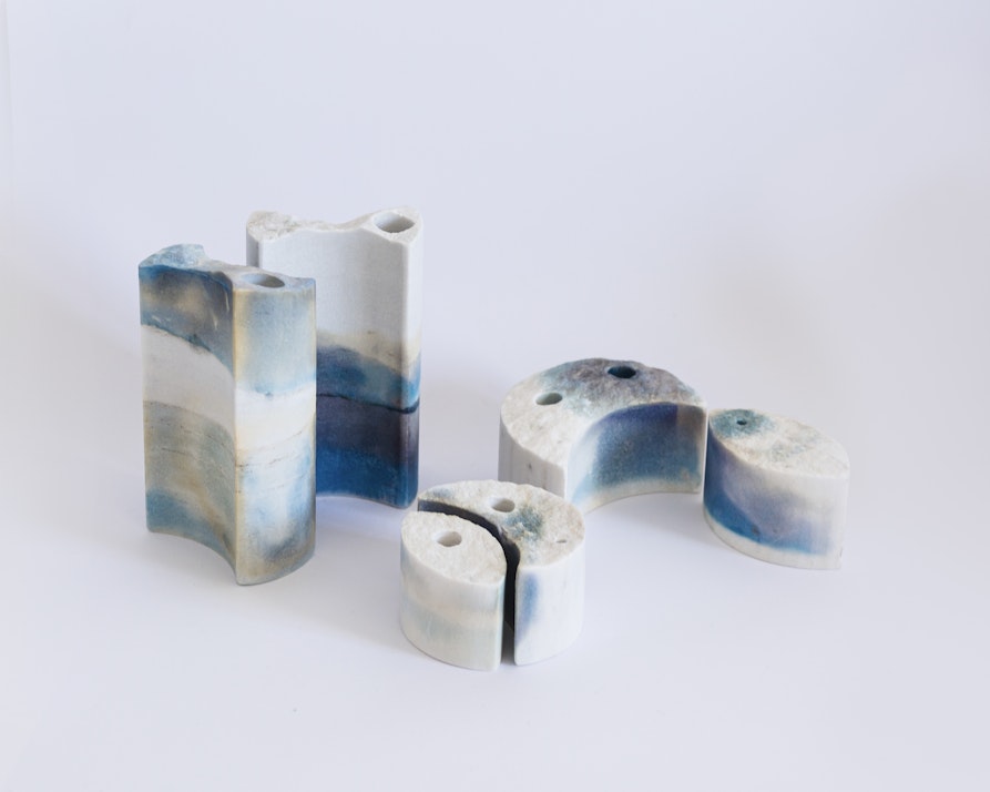 Spazio Materiae presenta il progetto Pietre Trovanti+Teresa Carnuccio: una serie di sculture, che incantano per la loro forma e matericità, nate dall’incontro tra la tecnica della cianotipia indagata da Teresa Carnuccio e un materiale pregiato come il marmo Palissandro, che con le sue venature crea cromie poetiche dalla fluidità marina. Teresa Carnuccio, di stanza a Napoli, è un’artista multidisciplinare con un background in architettura e fotografia. La sua ricerca più recente ruota attorno al rapporto tra uomo e natura, indagata con la fotografia, ma senza l’uso della macchina fotografica, ricorrendo alla tecnica della cianotipia in relazioni ad elementi naturali come il sole, la sabbia e l'acqua salata.
