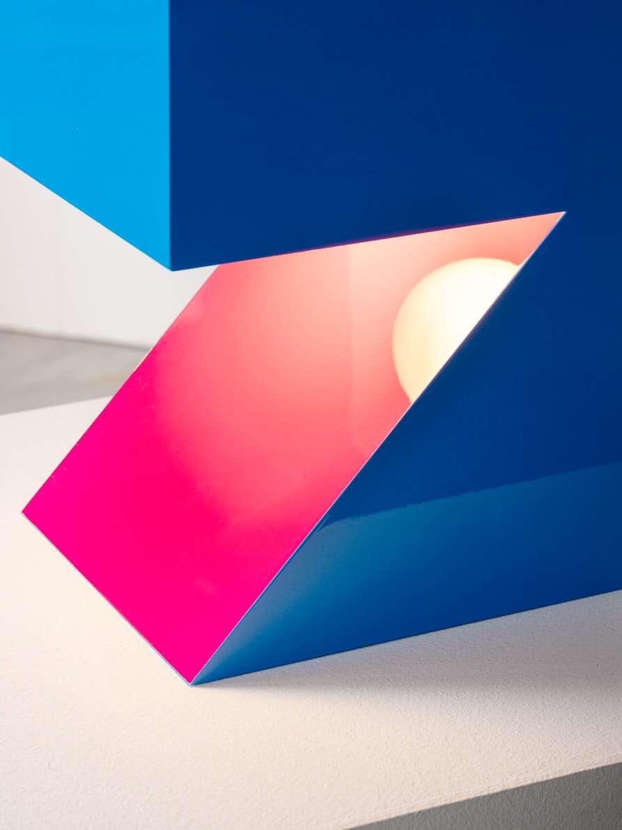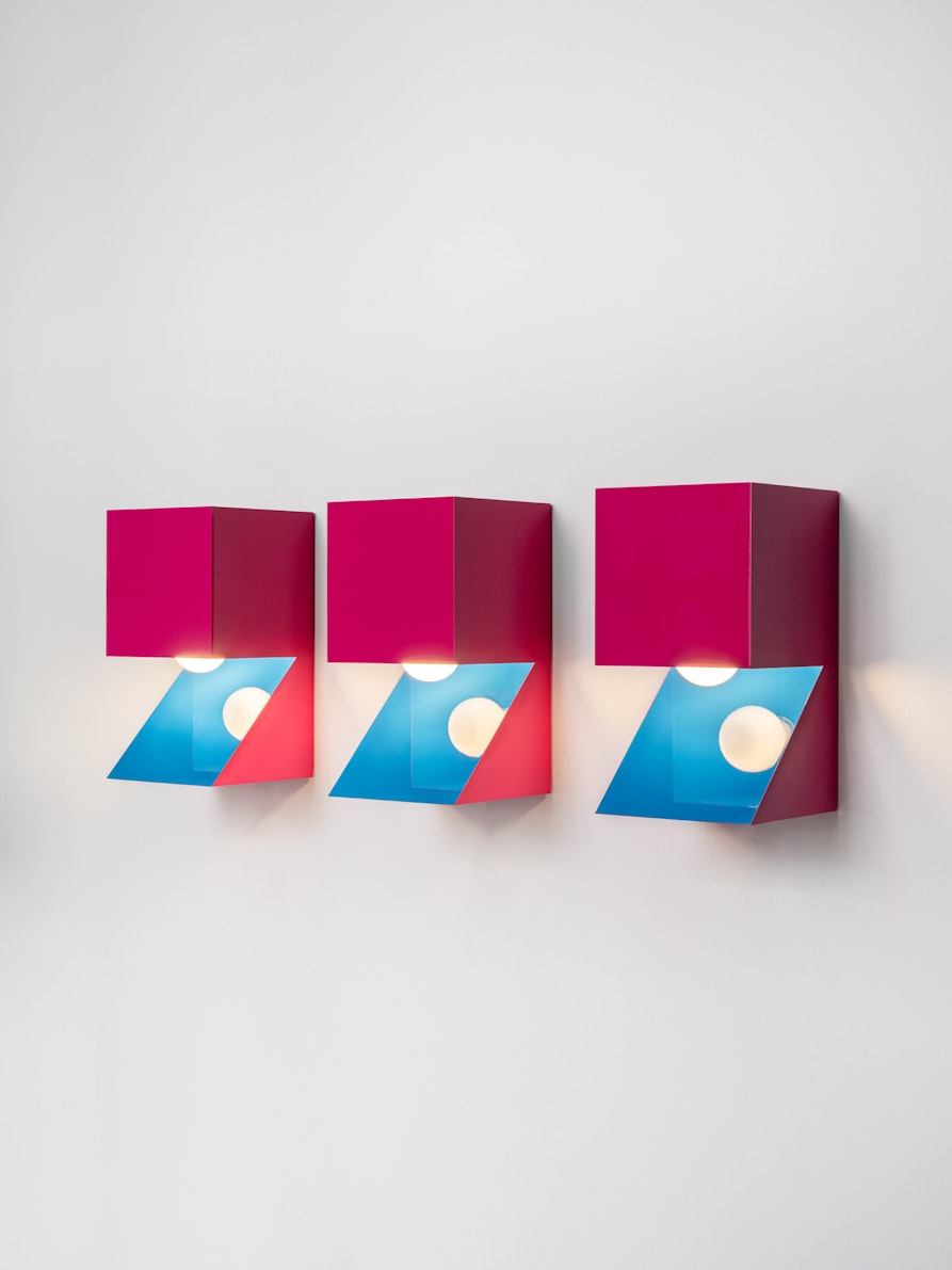 La luce NEFERTITI, realizzata in alluminio piegato/incollato, è concepita come un elemento modulare flessibile, assemblabile in più modi con dispositivi magnetici, o utilizzabile come luce indipendente. L'interazione tra geometria rigorosa e colore giocoso, la riflessione della lampada e il suo spazio sul pannello specchiato a 45 gradi fanno di Nefertiti un oggetto misterioso e aperto a molteplici interpretazioni.
