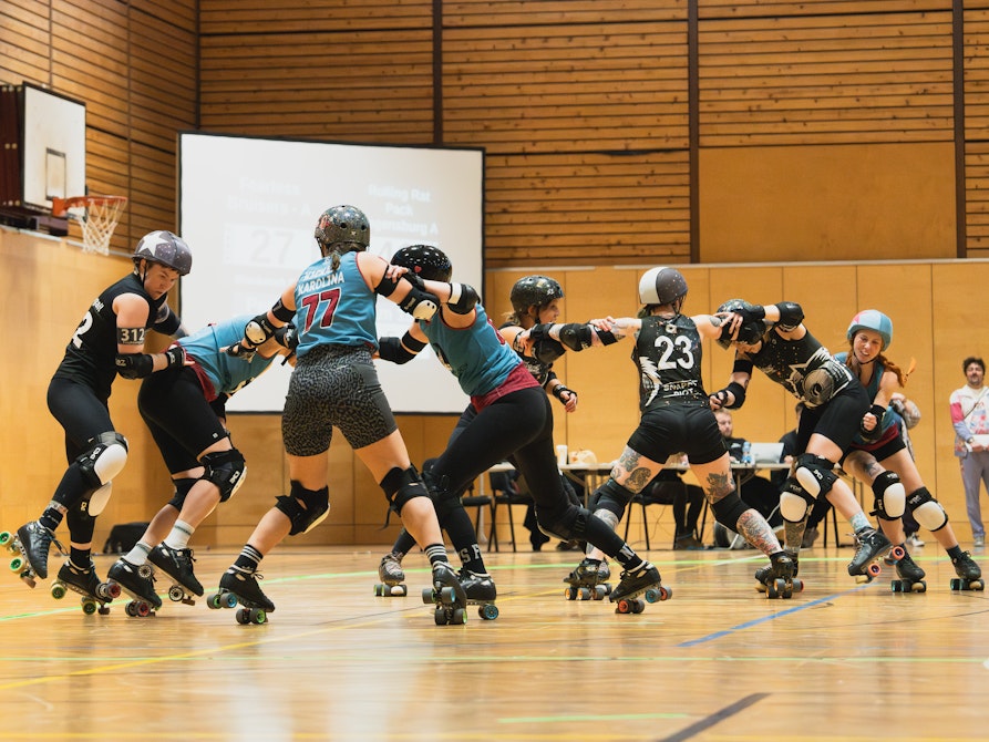 Für uns ist das ein riesiges Ding. Es fühlt sich immer noch nicht real an, dass wir überhaupt ausgewählt wurden: Wir haben uns als Austragungsort unter anderem gegen New Orleans und Lansing (Michigan) durchgesetzt. Darauf sind wir auf jeden Fall sehr stolz. Die Organisation verlangt einigen von uns so ziemlich alles ab. Da Roller Derby eine Randsportart ist, gibt es im Vergleich zu anderen Sportarten viel weniger etablierte Strukturen – das kann mitunter anstrengend sein, weil man sich vieles erst von Grund auf entwickeln muss und es nur begrenzt Unterstützung gibt. Das World Cup Committee, das den RDWC veranstaltet, besteht zum Beispiel auch nur aus drei Personen, die wiederum mehrere Crews managen. Neben den Teams müssen zum Beispiel auch Officials, Volunteers, Moderator*innen, Sponsoren usw. koordiniert werden.
