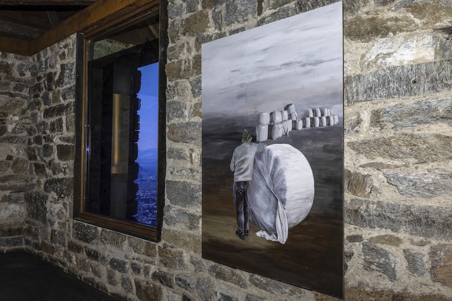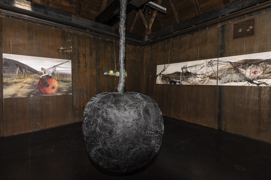 Die Künstlerin beschäftigt sich mit den Widersprüchen der Südtiroler Landwirtschaft, zwischen Tradition und Lobbyismus, jedoch ohne zu urteilen. Mit ihren vielschichtigen Kunstwerken setzt sie Impulse, über das nachzudenken, was direkt vor unserer Nase liegt – und bringt uns damit in einigen Fällen vielleicht auch zum Schmunzeln. Denn wenn man solch komplexe, gesellschaftsnahe Themen bearbeitet, spielt Humor natürlich eine große Rolle. Und tatsächlich fehlen in der Ausstellung weder übergroße Äpfel noch der berühmte blaue Schurz.