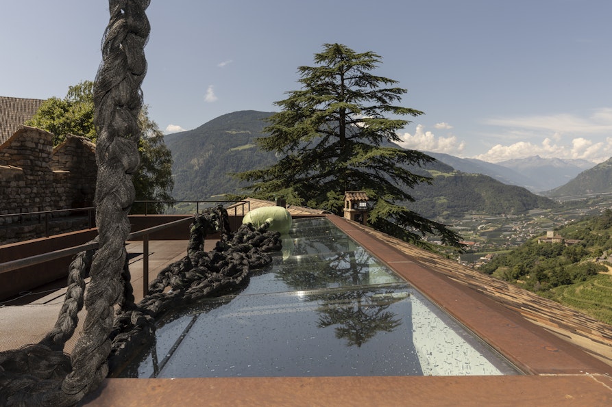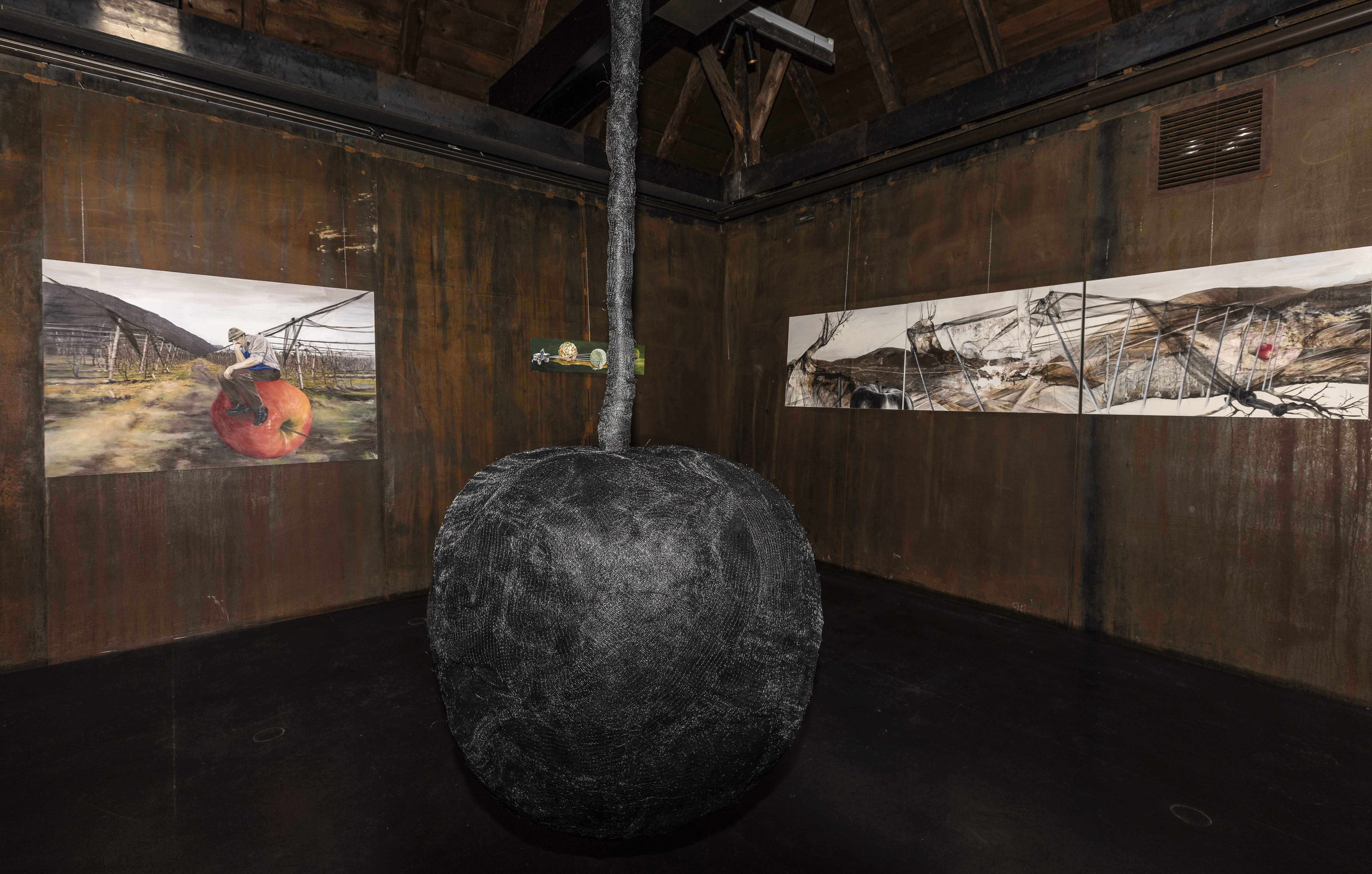 Der Name Black Lady bezeichnet nicht etwa den neusten Club-Apfel aus der einheimischen Kompilation, sondern einen riesigen Apfel aus alten Hagelschutznetzen, den Elisabeth Frei bei ihrer aktuellen Ausstellung Was kriegt der Bauer? auf Schloss Tirol präsentiert.