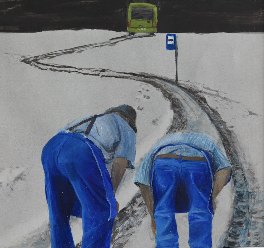 Die Reaktionen auf meine Arbeiten sind häufig von Humor begleitet. Ich bin überzeugt, dass Humor, insbesondere wenn er mit Feingefühl eingesetzt wird, eine Brücke für den Dialog schaffen kann. In meinen Werken arbeite ich oft mit versteckter Ironie, die niemals verletzend, sondern stets augenzwinkernd ist, als Spiegel der Gesellschaft. Viele Betrachterinnen und Betrachter erkennen sich selbst in meinen Arbeiten wieder. Der blaue Schurz, der in mehreren meiner Werke auftaucht, fungiert dabei als Symbol – er verdeckt, schützt, verbindet mit der Heimat und vermittelt ein Gefühl von Vertrautheit und Sicherheit.