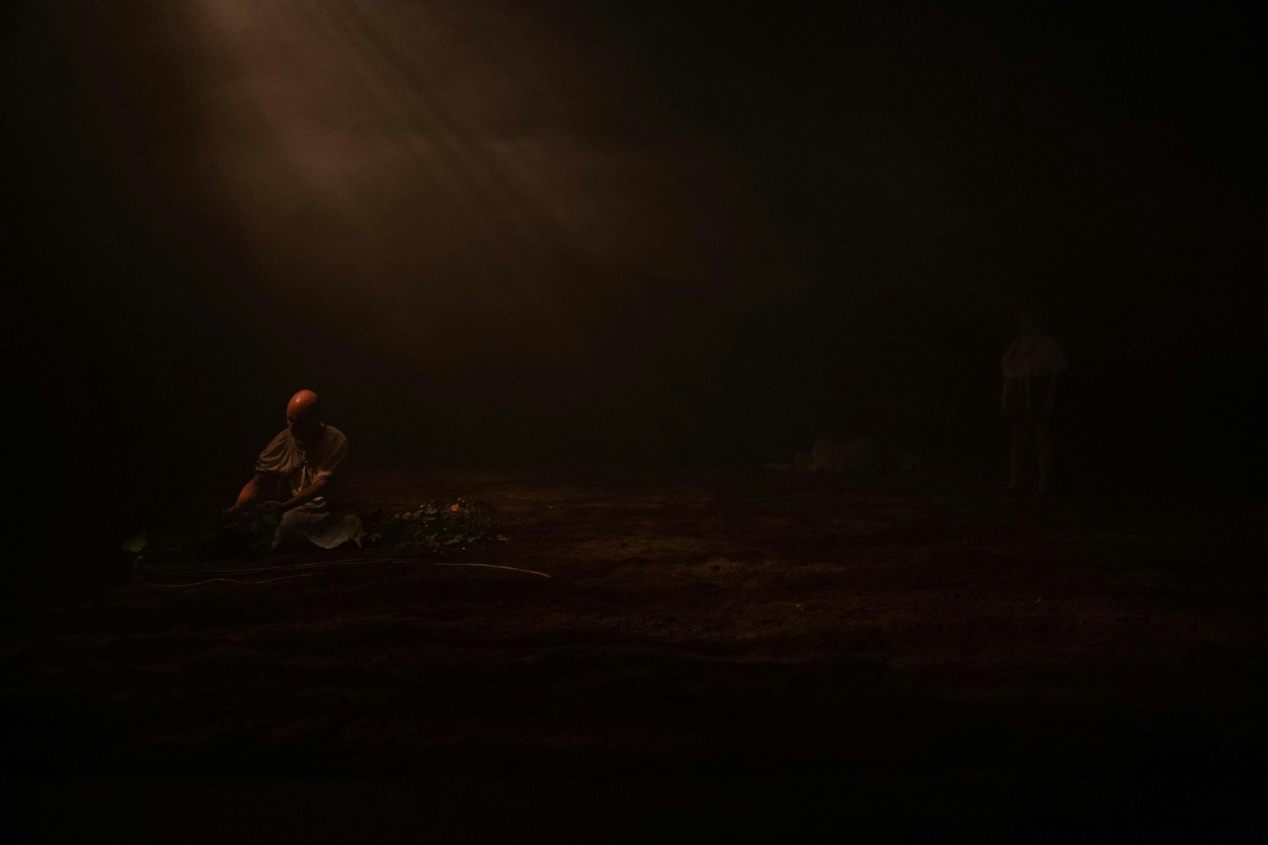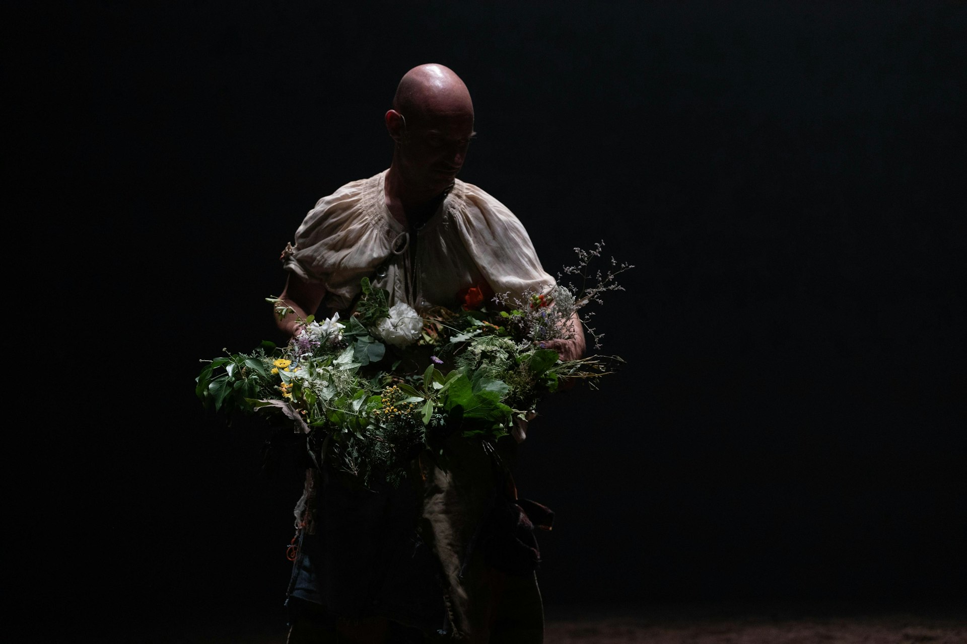 La scena non è costruita per evocare un simbolo: non c’è rappresentazione, ma presenza. La drammaturgia è materica, fatta di elementi viventi, di terra, di piante, di oggetti che hanno una propria esistenza. «Il suo ruolo drammaturgico non è simbolico, ma è materico. Così come lo sono le piante. E lo è la ghirlanda».