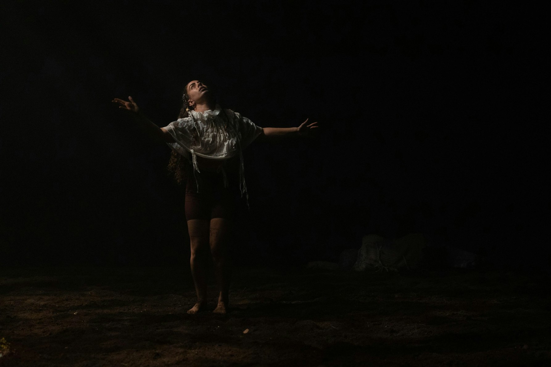 I costumi, realizzati da Maxine Simonetto, abitano un’estetica arcaica e decostruita, capace di evocare figure quasi mitologiche. La cotta di maglia, le casacche larghe e un senso diffuso di decadenza contribuiscono a definire uno spazio liminale, dove i corpi sembrano già sul punto di disfarsi. La terra, elemento vivo della performance, interagisce con gli abiti, trasformandoli. Anche il suono – curato da F. De Isabella – segue una logica immersiva e panoramica, componendo paesaggi che si muovono in dialogo con parola e luce, come una soglia che anticipa ciò che verrà.