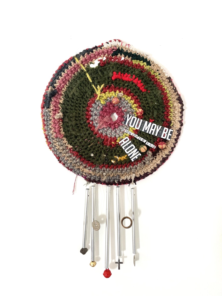 Acchiappasogni ist ein runder Traumfänger, den ich gehäkelt und umgedreht habe, um seine „nicht perfekte“ Seite zu zeigen. Ich habe darin Wörter und Gegenstände zusammengesetzt, die mit dem Reisen und dem Kult zu tun haben und die so nur für mich verständlich sind. Die Metallröhrchen und Glöckchen, die von dem Traumfänger baumeln, klingen, wenn man sie berührt oder ein Luftzug weht – so erhält das Kunstwerk also eine Stimme.