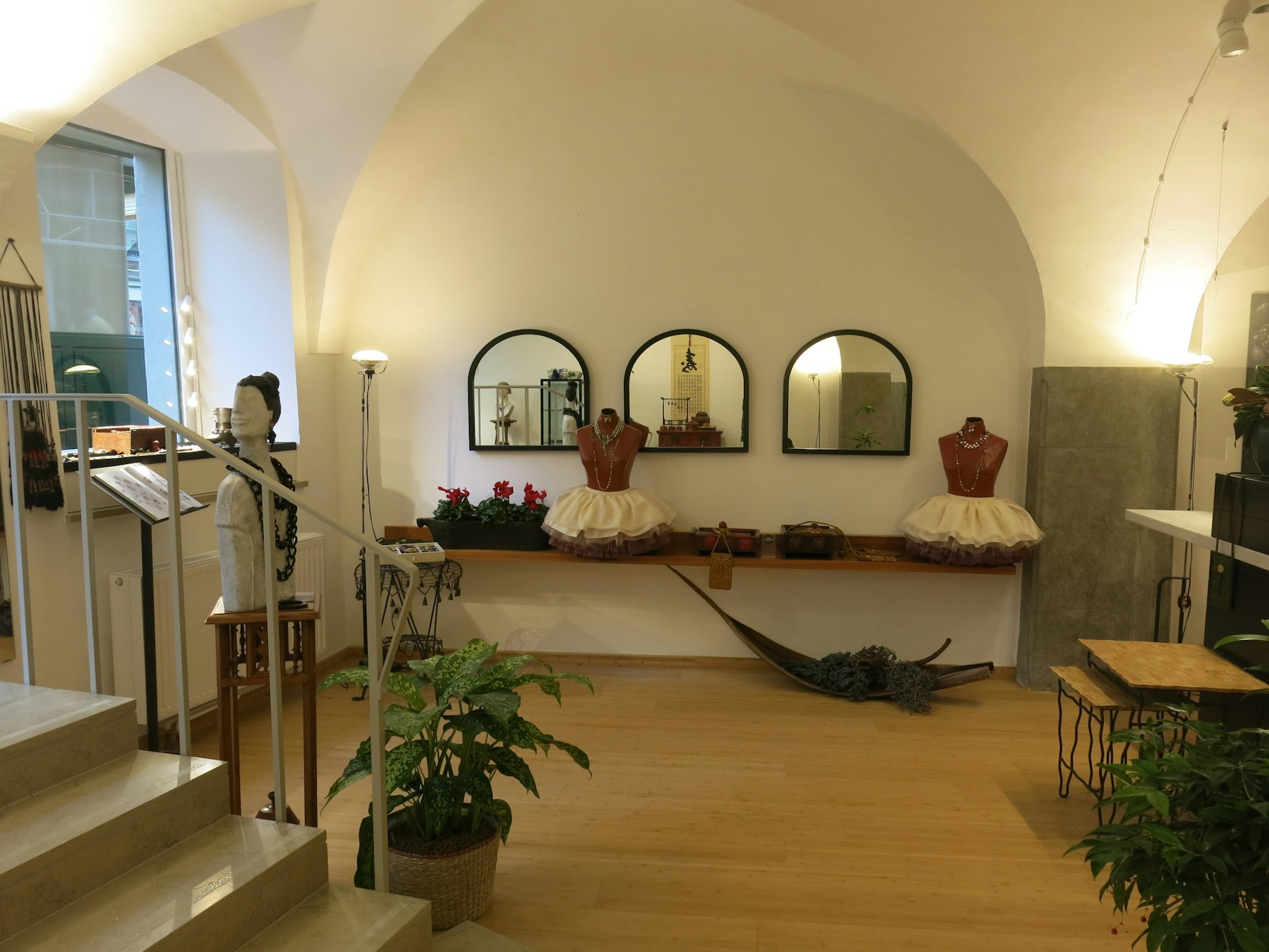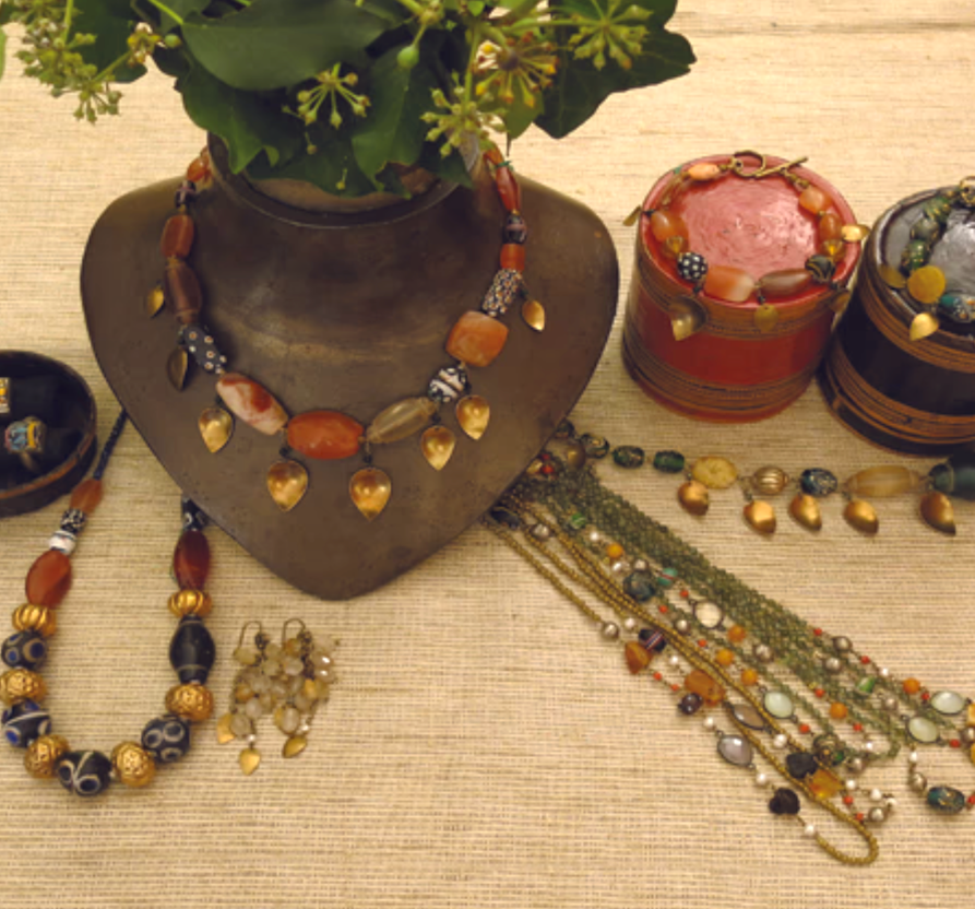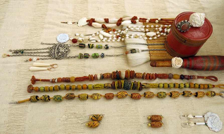 Le vetrine sono un invito a un viaggio sensoriale. Jacopo indica "le murrine africane con il ramo di corallo vecchio, il bracciale macramè che richiede 30 ore di lavoro per annodare i fili del corallo e una moneta cinese come chiusura". Poi orecchini con montatura in oro realizzati con "vetri che hanno molti secoli: in origine erano blu, sono divenuti bianchi per l'affioramento della soda". E i turchesi, che "quest'anno hanno una qualità stupenda". Le teiere da collezione di Carla, non in vendita, diventano espositori per anelli, ambre e altri coralli. Non mancano i "giochini" per l'estate, come gli orecchini con pesciolini in ottone smaltato, spiritosi e leggeri, "perfetti per un beach party".