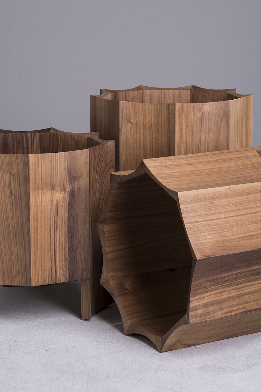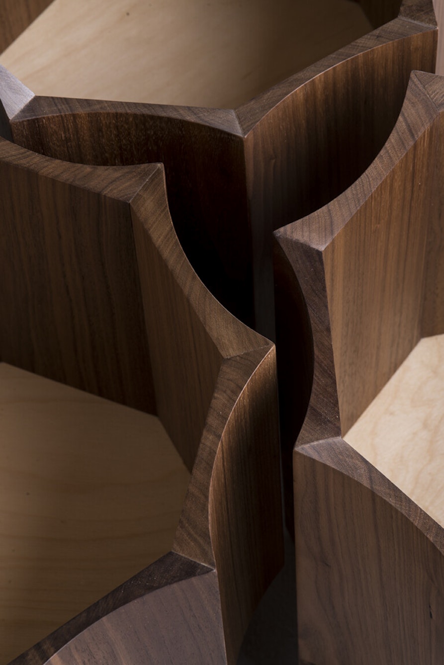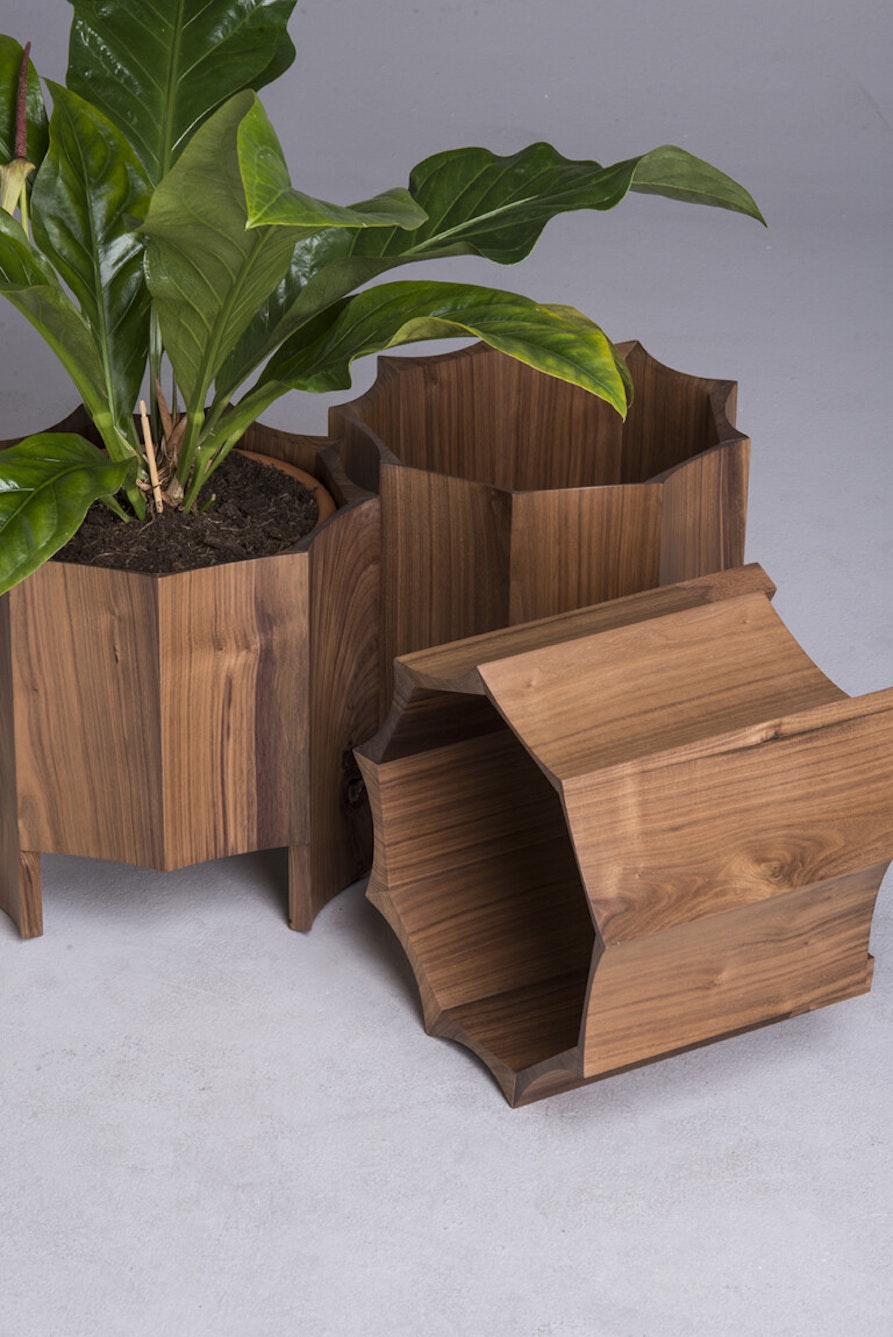 Tra i progetti più rappresentativi, l’E9 Planter, lanciato nel 2021, incarna perfettamente la poetica dello studio. Il nome deriva dai nove spigoli della sua struttura, nata dal recupero di pezzi di linoleum riciclato. Ma è con l’E9 Planter Sun Edition che il progetto compie un’evoluzione formale e concettuale: introdotto recentemente, questo vaso a tre gambe interamente realizzato in noce rende omaggio al sole — simbolo di vita, luce e trasformazione — introducendo nuove curvature nel design e riaffermando l’armonia tra estetica e natura.