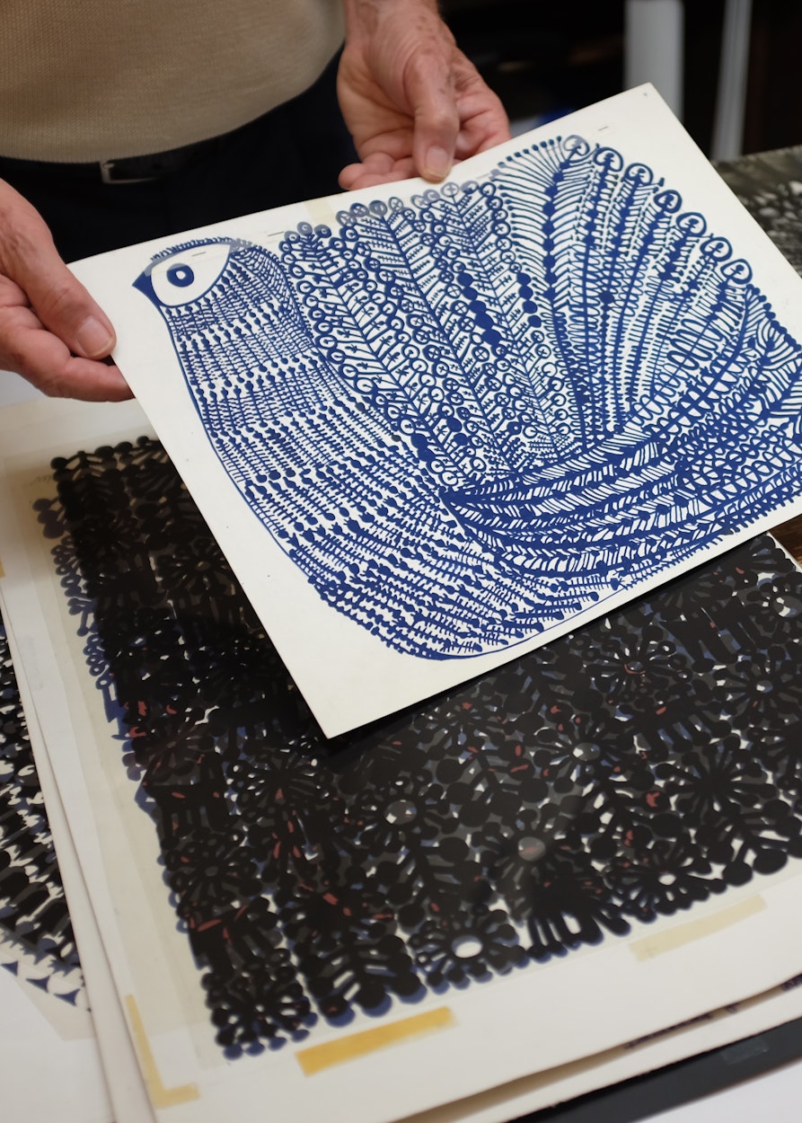 È in questa occasione che i due designer scoprono alcune delle stoffe serigrafate realizzate da Handdruck, collettivo che Aufschnaiter fondò nel 1973 assieme a un gruppo di quattro designer e artisti internazionali nei primi anni settanta. L’intera produzione, si svolse nel laboratorio di stampa serigrafica costruito nel retro del negozio e venne interrotta nel 1993. Da allora, i telai sono andati perduti e a dare traccia della loro pratica rimangono solo i disegni originali ed alcune stoffe invendute.