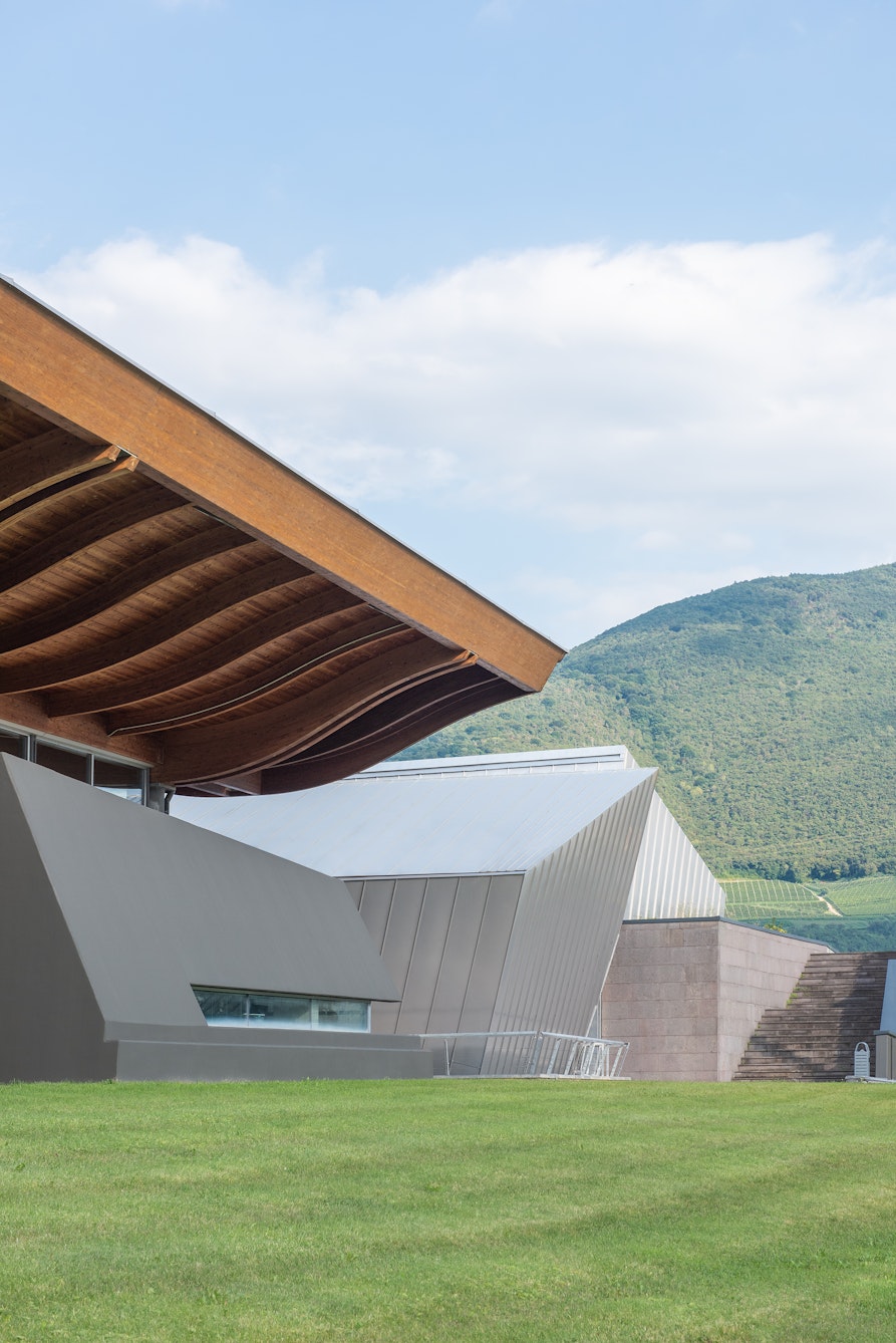 Il design della cantina Rotari, con il suo tetto a onda che evoca il profilo dei vigneti a pergola, è un'opera di bioarchitettura che si integra con armonia nel paesaggio. La struttura disegnata dall’architetto Alberto Cecchetto unisce design, tecnologia e natura.