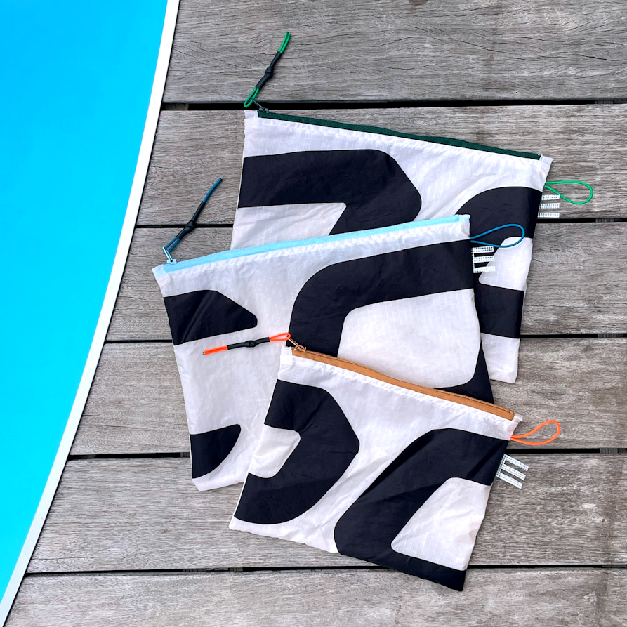 Di parapendii ce ne sono di grandi e piccoli, ma in media hanno una superficie di 20 m2 per parte, per un totale di 40m2 circa. Non ho mai fatto questo conto ma essendo estremamente grande potrei idealmente realizzare 10 giacche o 50 borse, buste. Poi certamente dipende dal modello, dalle misure e anche dalle forme e dai colori. Il processo creativo parte sempre dal disegno perchè mi piace molto fare schizzi con colori e forme. Poi passo provo subito a cucire, faccio qualche prova e vede se mi piace, e correggo le misure e le proporzioni direttamente alla macchina da cucire.