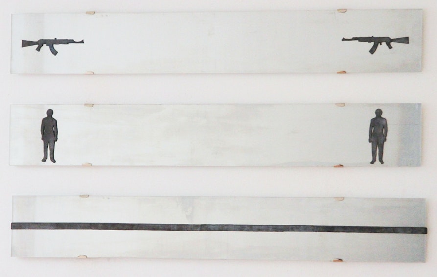Die Elemente im Bild sind klar und eindeutig: ein Maschinengewehr, ein Mann, eine Linie. Es handelt sich nicht um eine Anschuldigung, sondern eine Frage, die sich auf mehreren Ebenen bewegt. Es macht uns bewusst, dass bestimmte Systeme sicher eine Verantwortung für die Geschichte tragen, die sich noch immer wiederholt. Doch die Frage im Titel „Non c’è due senza tre?“ stelle ich auch mir selbst, sie ist eine Einladung bzw. eine Suche nach einem ehrlichen Austausch mit allen.