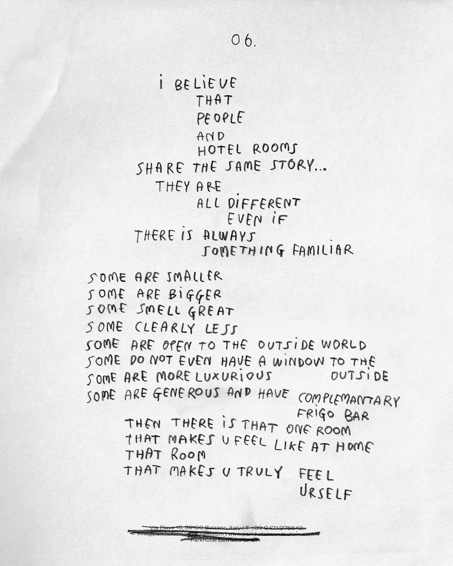 Esattamente. Volevo rompere quell’immagine levigata e controllata. Nelle mie stanze non è entrato nessuno per settimane: costruivo set, lasciavo il caos, lavoravo anche di notte. L’hotel è pensato per essere ordinato, impeccabile; io ho cercato il contrario. Volevo creare un contrasto tra l’idea di perfezione e la realtà del vissuto, perché è nel disordine che spesso si rivela la poesia delle cose.