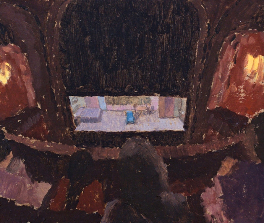 Una mostra che risucchia il pubblico in un’atmosfera dai confini mutevoli, caratterizzata da un movimento insieme centrifugo e centripeto: un continuo alternarsi di espansione e contrazione, dal dettaglio sussurrato al panorama dilatato, dall’intimità calda e densa di teatri newyorkesi, ai vuoti urlati dai contrasti netti delle strade di Vancouver. Gli sguardi si muovono incessantemente, dentro e fuori, guidati da dispositivi capaci di creare incantesimi: che si tratti di tavole dipinte, frammenti ritagliati dalla “scatola magica” per eccellenza – il teatro –, oppure di visioni catturate, attraverso inquadrature fotografiche analogiche, in angoli sospesi e senza tempo di strade metropolitane.