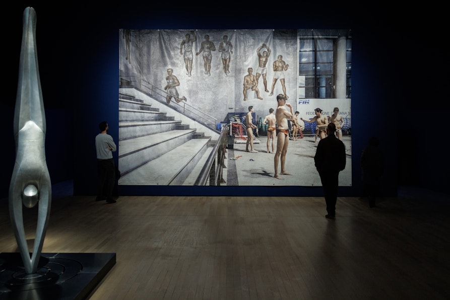 Oltre due millenni e mezzo di storia compressi in otto sezioni tematiche, da "Le origini" a "Al freddo", per celebrare l’umanità in movimento. Curata da Antonio Calbi, direttore dell’Istituto italiano di cultura di Parigi, e da Daniela Ferrari, curatrice del Mart, l'esposizione propone più di 300 opere, oggetti e cimeli in dialogo attraverso i secoli. Dal sacro al profano, dal Discobolo di Mirone evocato dal mito e dalle suggestioni antiche fino alle icone contemporanee, il percorso dimostra come l’arte abbia sempre amplificato l'epos sportivo. Il corpo è il fulcro, l'unico vero protagonista: non solo macchina perfetta che insegue il record ma anche tempio di fatica, vulnerabilità e fallimento. Non solo la potenza scultorea dei lottatori ritratti da Mimmo Jodice, che sembrano riverberare l'antichità nelle sale del Museo Archeologico Nazionale di Napoli, o il dinamismo astratto degli "Atleti" di Umberto Boccioni. La mostra non rifugge dalle tensioni fisiche ed emotive, dalle opposizioni tra perfezione e cedimento, tra record e limite, come nella scultura meno eroica del "Lottatore acefalo" di Marino Marini.