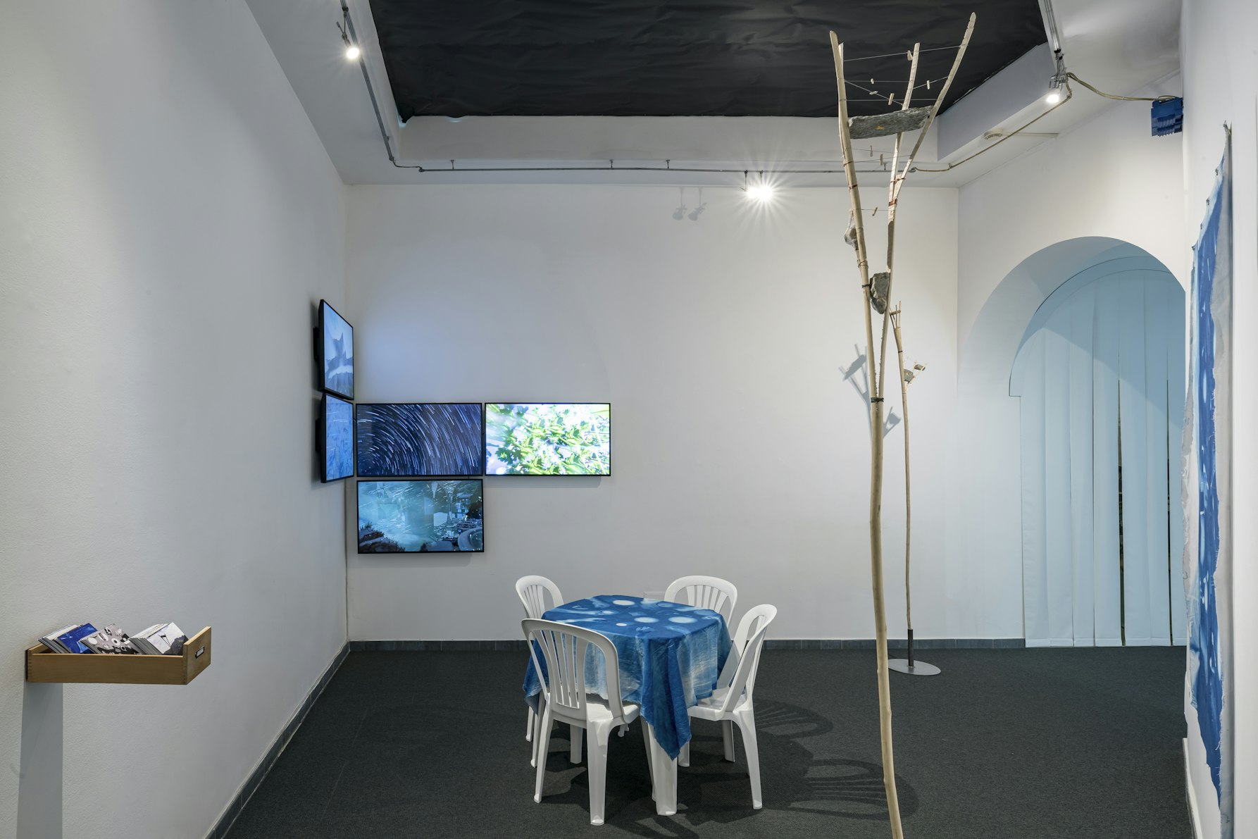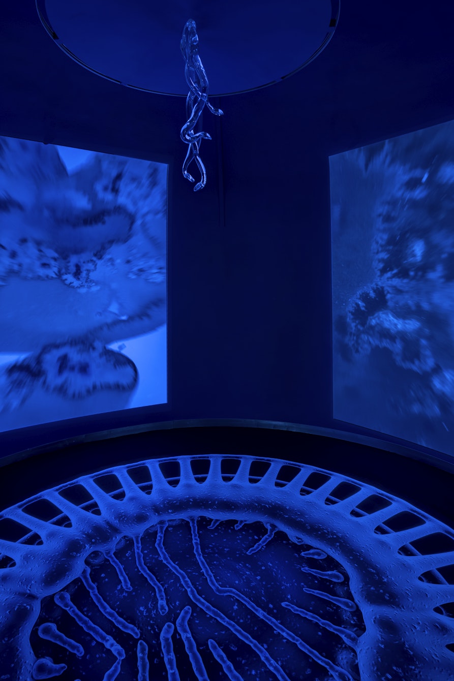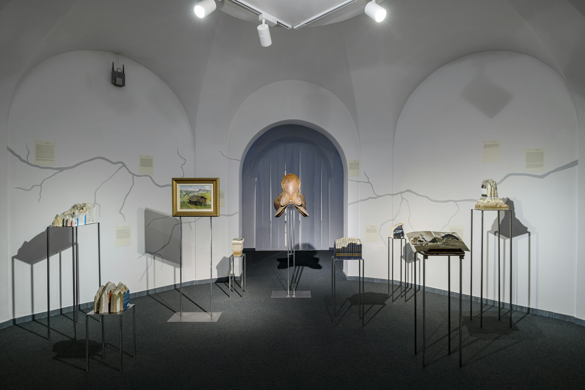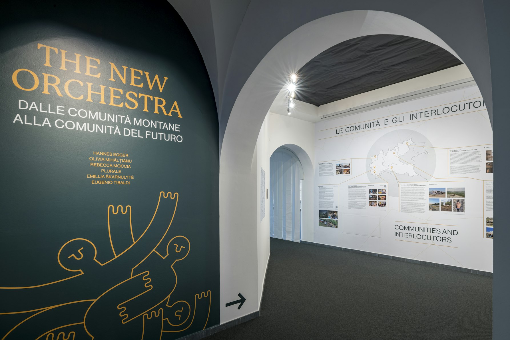 Lo spazio che accoglie il progetto ha curiosamente una forma circolare, e il pubblico, chiamato a muoversi in tondo per fruire le opere di Olivia Mihălțianu, Rebecca Moccia e plurale, è naturalmente portato alla scoperta, all’incontro e al pensiero non lineare. Al centro, i due lavori di Hannes Egger e di Eugenio Tibaldi, allestiti in stretto dialogo tra di loro, evocano in maniera sia fisica, sia concettuale, un’orchestra possibile nella quale ogni spettatrice e ogni spettatore può realmente avere un ruolo attivo. La mostra è stata infine l’occasione per rigenerare una sala del museo (collocata nella parte più antica dell’edificio che ospita il museo), all’interno della quale è stata allestita l’opera immersiva di Emilija Škarnulytė.