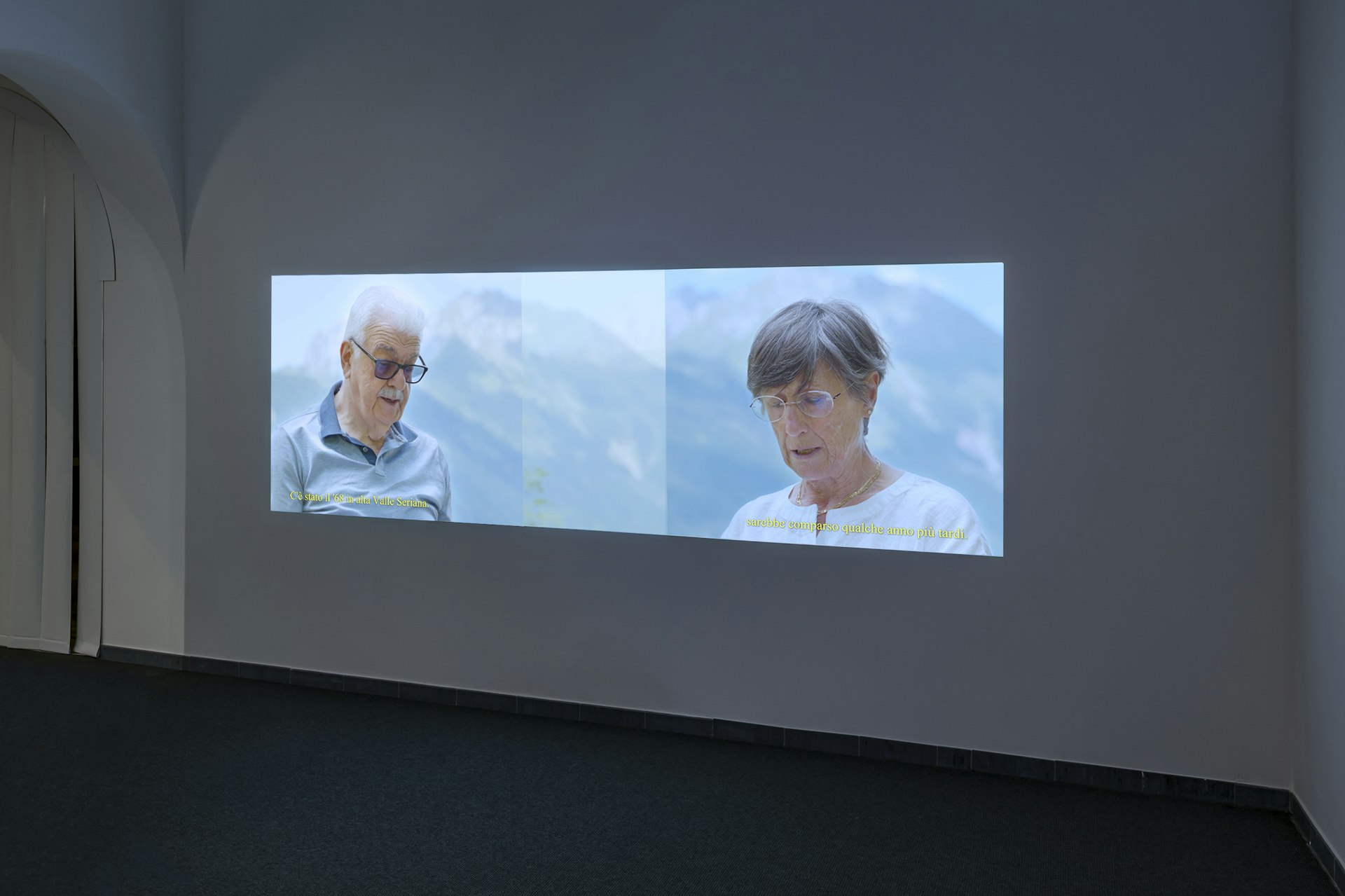 Rebecca Moccia, invita a una visione complessa e decentralizzata, che superi le narrazioni nostalgiche e passivizzanti dei territori montani e li riconosca come luoghi politici e vitali di partecipazione, restanza e resistenza. Il collettivo plurale documenta la vitalità della comunità di San Martino in Badia, dove la musica rappresenta un potente elemento di connessione tra le persone e con la montagna a livello transgenerazionale. Eugenio Tibaldi porta nove storie di giovani e meno giovani che hanno scelto la Valle Stura come luogo di ripartenza, raccontando la montagna come spazio di necessità e possibilità. Hannes Egger presenta un’installazione sonora che riproduce un esercizio di humming collettivo, realizzato insieme a una parte della comunità di Eresaz, in Valle d’Aosta. La voce dei singoli diventa forza nell’unione. Il coro, al quale il pubblico è chiamato ad unirsi, rimarca la straordinaria potenza dell’insiemanza. Olivia Mihălțianu restituisce la residenza a Rorà, Valle Pellice, mediante un lavoro che sottolinea l’importanza dello spazio pubblico e dei riti collettivi in quanto momenti di attivazione di sentimenti come la partecipazione, la resistenza, la convivialità e l’intraprendenza. Infine Emilija Škarnulytė, che dal confronto con la realtà di Travo, micro-comunità dell’Appennino Emiliano, attiva una riflessione sullo storico e ancestrale legame delle persone con la Pietra Perduca e la Pietra Parcellara, due enormi rocce ofiolitiche-vulcaniche che dal passato e fino ad oggi alimentano una cosmogonia della montagna che si proietta nel cielo.