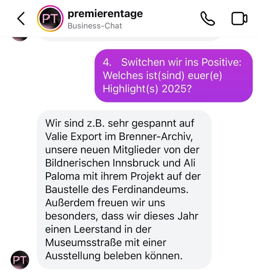 November ist in Innsbruck Premierentage-Zeit. Seit 1998 Schon. Das Festival für zeitgenössische Kunst bietet alljährlich für 3 Tage ein Programm voller Ausstellungseröffnungen, Führungen oder Artist Talks. Welches sind die heurigen Highlights der Premierentage (PT) – von 6. bis 8. November 2025? Um das (und mehr) zu klären, ist franzmagazine in Person von Barbara Unterthurner den Organisatorinnen des heurigen Festivals, Mona Erhart (arbeitet bei der KZ-Gedenkstätte Mauthausen) und Delia Salzmann (kuratorische Assistenz beim aut. architektur und tirol) in die Insta-DMs geslidet.