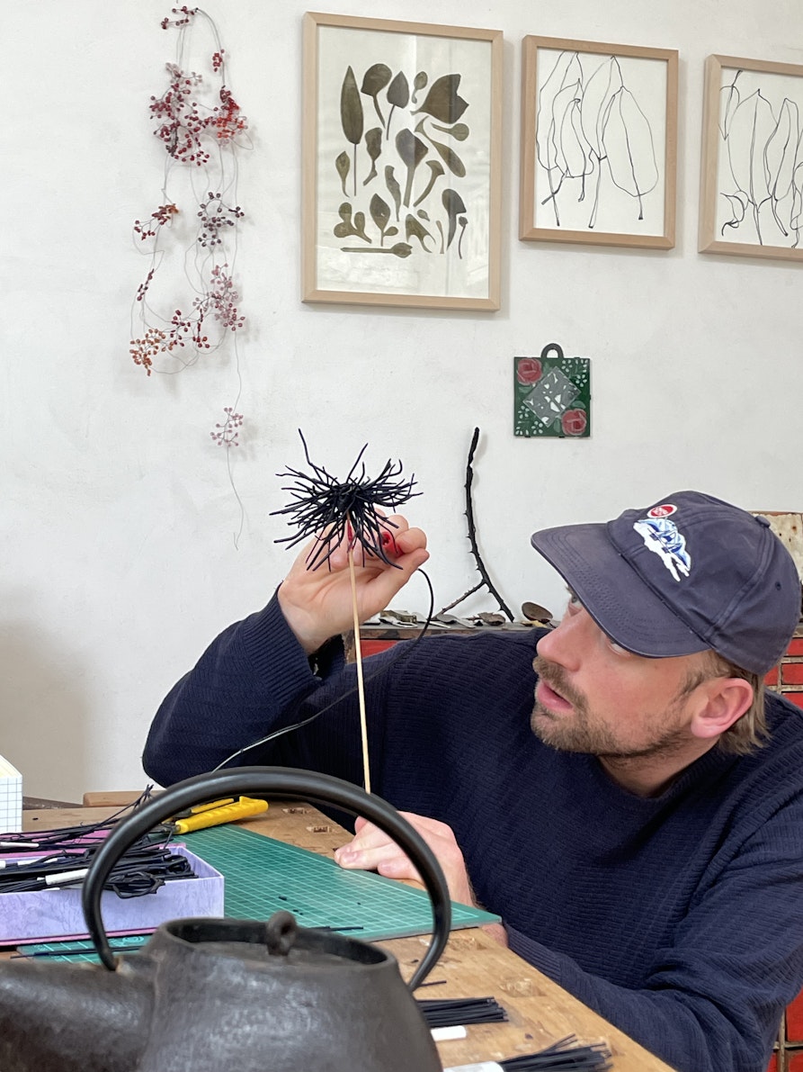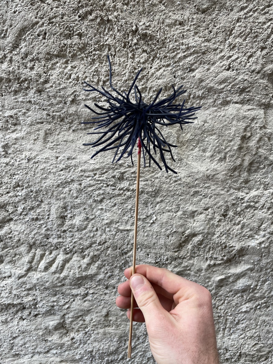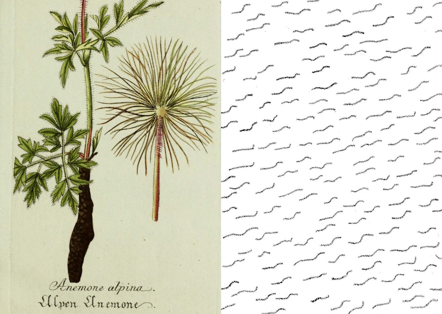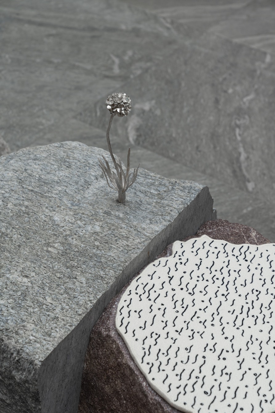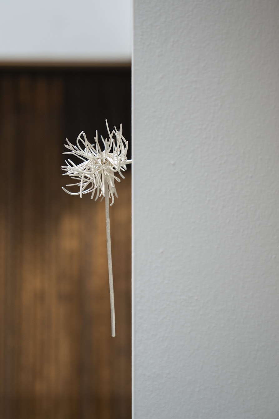 Due sculture fuse in argento — l’Armeria alpina e la Pulsatilla vulgaris — completano l’installazione. Sono piante che, nel folklore locale, vengono chiamate “streghe dello Sciliar” per i loro capolini arruffati che il vento agita come chiome scomposte. In argento diventano reliquie luminose: due presenze delicate e al tempo stesso potenti, che condensano l’essenza delle figure femminili legate alla montagna. Non sono decorazioni, ma amuleti. Custodiscono la memoria di una relazione antichissima tra donne, piante e vento: un’alleanza che sfugge al controllo razionale e vive nei dettagli, nel movimento minimo di un fiore che vibra come un presagio.