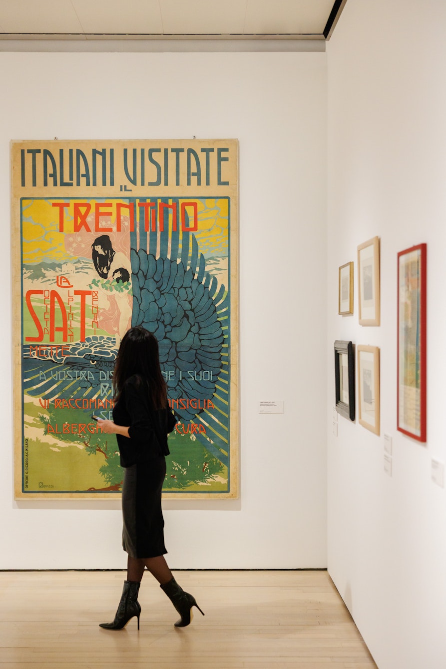 Nella scelta del lungo corridoio “alto” del Mart, dove scorrono riproduzioni e disegni viennesi, Tiddia ha visto un omaggio al Fregio di Beethoven di Klimt, pensato per correre sopra lo sguardo dello spettatore, e un modo per preparare l’occhio del visitatore all’incontro con l’Orfeo di Bonazza, con le sue citazioni puntuali: dalle placchette in rame di Georg Klimt ai ritmi ascensionali che rimandano alle grandi tele per l’Università di Vienna.