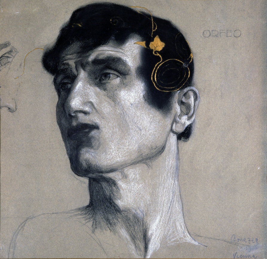 Il percorso espositivo è introdotto da una vera e propria “galleria viennese” che restituisce il clima artistico in cui Bonazza si è formato per arrivare poi con un solo colpo d’occhio al suo celebre Orfeo: riproduzioni dell’Album Heller dedicato a Gustav Klimt, opere e documenti provenienti dal Belvedere, dal MAK e dalla Klimt-Foundation, lavori di Franz von Matsch, Georg Klimt, Ludwig Heinrich Jungnickel, Franz Jaschke, Rudolf Junk e Ferdinand Hodler.