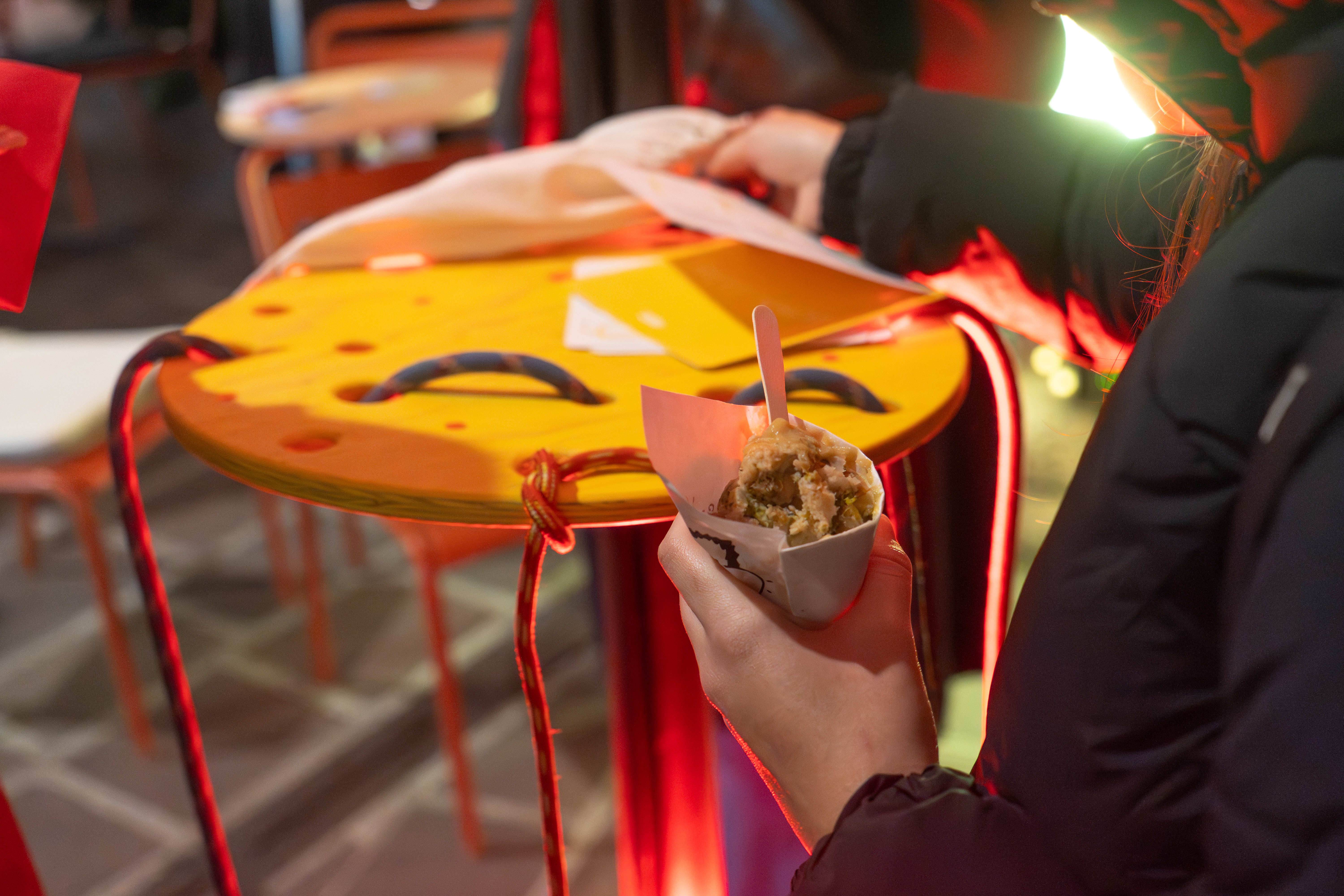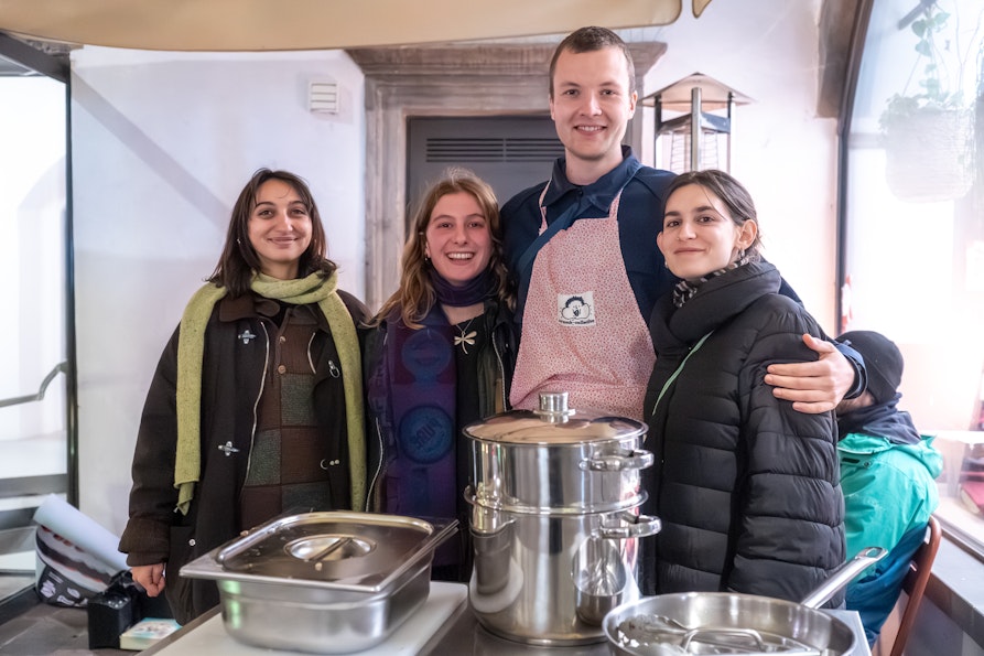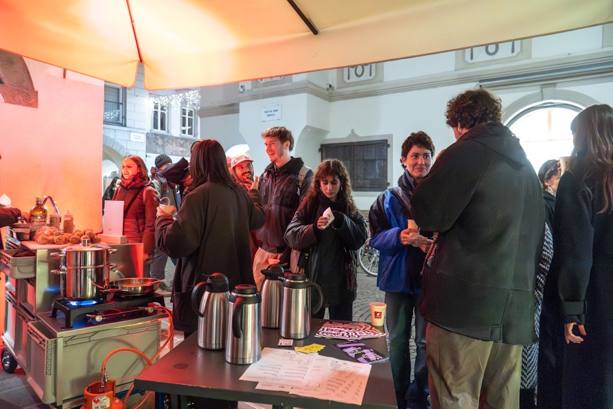 Direkt daneben dampft und duftet es: Das Crumb Collective serviert vegetarische Knödelvariationen und warmen Punsch aus ihrer selbstgebauten, mobilen Küche. Gerettete Lebensmittel, offene Gespräche, warme Hände. „Wir wollten aus dem spielerischen Umgang mit Resten etwas machen, das Menschen zusammenbringt“, sagen sie – und es funktioniert. Kaum jemand geht hier vorbei, ohne wenigstens kurz stehenzubleiben und Punsch und Knödel zu probieren.