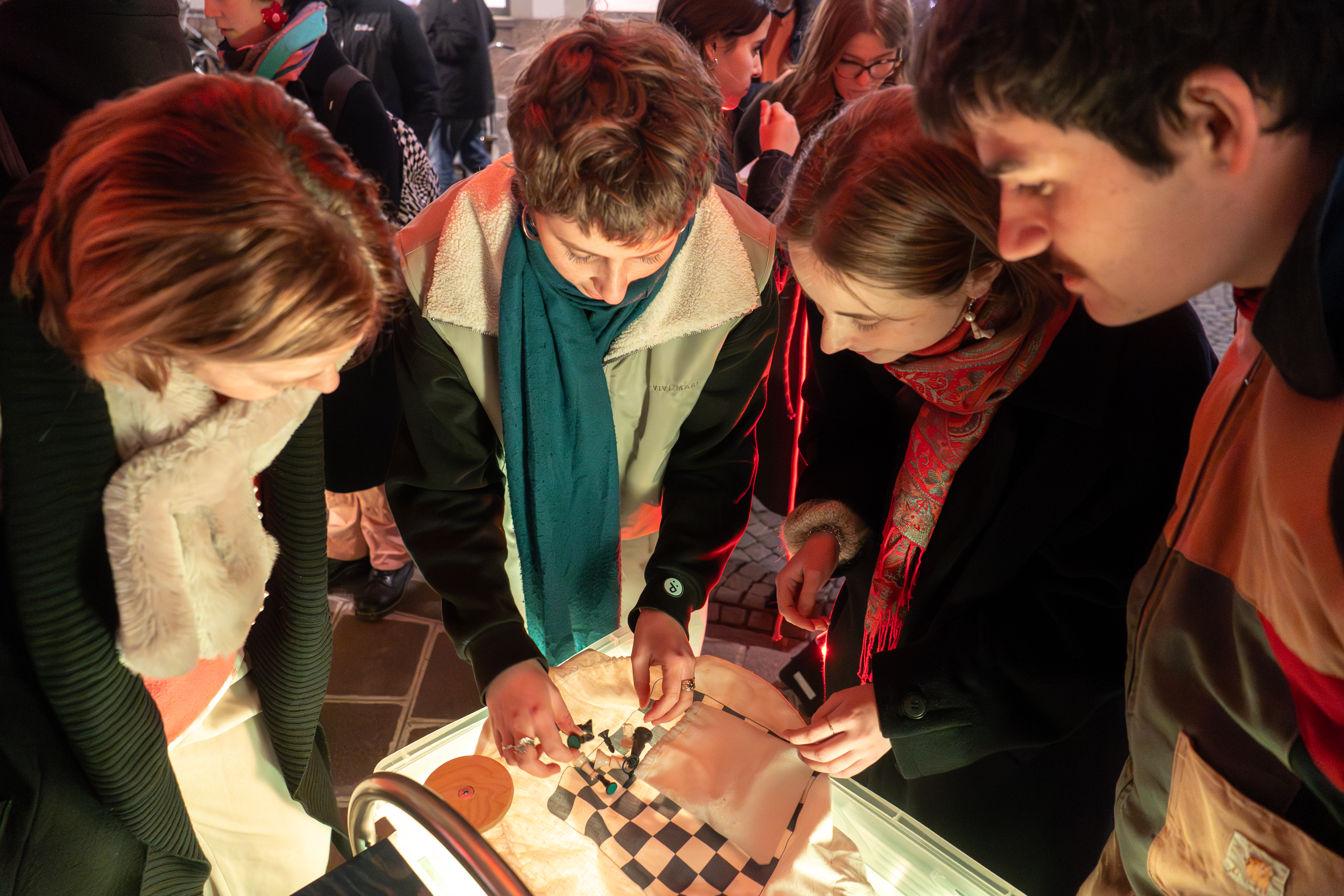Zwischen Waaghaus und Madonna-Apotheke stehen Leika Su Kutzke und Steffi Feiertag mit ihrem Projekt O:PLAY, eine mobile Spielstation, gebaut aus einem recycelten Zeitungsaufsteller, der nun zwei vollgepackte Kisten mit allen möglichen Spielen transportiert. Dazu runde Tischplatten, die sich an Bänken, Rohren oder Laternen befestigen lassen. „Wir haben uns gefragt, warum es in Parks zwar Bänke, aber oft keine Tische gibt – und warum sich niemand draußen zum Spielen trifft“, erzählen sie. O:PLAY möchte genau das ändern: einen Anlass schaffen, stehenbleiben, spielen, reden.