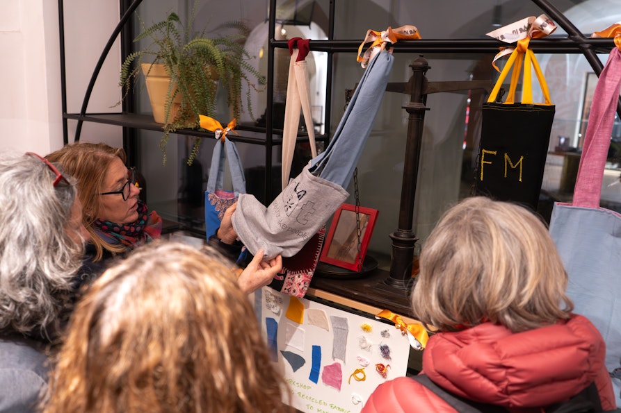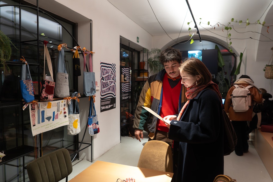 Im selben Raum präsentiert Laura Stimpfl ihre Stofftaschen aus dem Projekt Ritagli di storie: Borse che raccontano – entstanden in einem Workshop, in dem Textiltechniken und persönliche Erinnerungen miteinander verwoben wurden. Patchwork-Upcycling als kollektives Erzählen. Dann die Genossenschaft Kaleido, die wohl politischste Initiative des Abends. Ihr Ziel: solidarischer Wohnraum in Südtirol. „Das Verhältnis zwischen Mieten und Einkommen stimmt schon lange nicht mehr“, erklärt mir Leo aus der Kerngruppe des Projekts, „und wir wollen Immobilien langfristig dem kapitalistischen Markt entziehen, um sie als genossenschaftlichen Wohnraum zur Verfügung zu stellen“. Ein ambitioniertes Projekt – und gleichzeitig eines, das man hier dringend braucht.