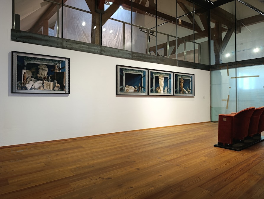 Johannes Inderst: Die Stühle stammen aus dem Meraner Stadttheater – es sind die letzten drei Exemplare, die noch im Depot aufbewahrt wurden. Wir haben beschlossen, sie als physische Objekte in die Ausstellung zu integrieren, auch weil sie im kollektiven Gedächtnis der Meraner eine besondere Rolle spielen. Während unserer monatelangen Arbeit im Depot standen sie stets direkt hinter uns. Oft haben wir uns auf diese Sessel gesetzt, um zu überlegen, wie wir die Szenen für die Fotografien arrangieren wollen. Heute können die Besucher:innen auf denselben Stühlen Platz nehmen und meine Arbeiten aus dieser Perspektive betrachten. Bei den fotografischen Inszenierungen standen hingegen die Depot-Regale für mich im Mittelpunkt. Sie ermöglichten es, räumliche Perspektiven zu schaffen und den Raum mit unserer Arbeit zu verbinden. Die Fotos zeigen die 50 von uns ausgewählten Objekte – manche nur teilweise, andere vollständig. Wir haben sie willkürlich zusammengestellt und durch diese Anhäufung ein neues Narrativ geschaffen, das ihre evokative Kraft erhöht. So verbergen sich hinter den Objekten vielfältige Geschichten: technische Geräte, Krippenfiguren, ein schwerer Marmor-Cube mit Haken, Messinstrumente zur Landvermessung. Die Herkunft vieler Artefakte lässt sich nicht mehr rekonstruieren. Gerade das machte die Arbeit spannend: Objekte, deren ursprüngliche Funktion oft unklar ist, die dennoch persönliche oder kollektive Erinnerungen transportieren. Einige Stücke tragen auch politische oder ikonografische Bezüge, wie etwa Adler-Symbole, die unterschiedlich interpretiert werden können. So wird deutlich, wie jedes Objekt auf seine eigene Weise Erinnerungen und Bedeutungen aktivieren kann. Persönlich bedeutungsvoll war für mich etwa ein SCM-Abzeichen, das Erinnerungen an meine Kindheit weckt, als ich Kunstturner war und wir diese Abzeichen auf unsere Trikots genäht bekamen. Die Bilder erzählen also von Fragilität, Isolation und funktionaler Mehrdeutigkeit der Dinge.