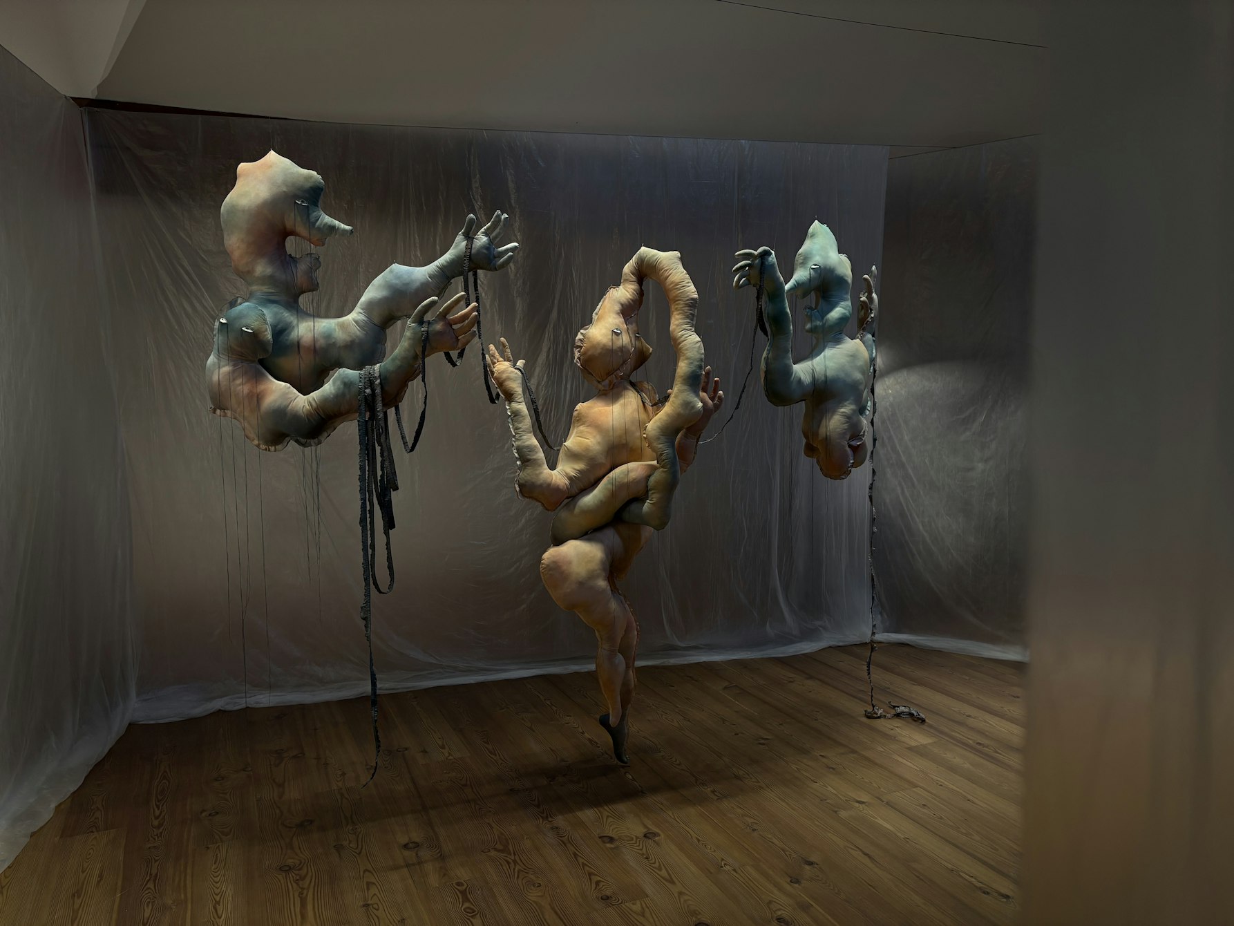 Valeria Ferrari: Timetricks ist zwar hier vor Ort im Atelier von Johannes entstanden, normalerweise arbeite ich jedoch in meinem Atelier zu Hause in Mailand. Diese Dimension häuslicher Intimität fließt stets in meine Arbeiten ein. Für diese Ausstellung ließ ich mich von den mythologischen Figuren der drei Parzen inspirieren, die den Lebensfaden spinnen: Die Vergangenheit webt den Faden, die Gegenwart misst ihn, die Zukunft schneidet ihn. Ein Symbol für das Ende des Lebens, zugleich aber in einer hoffnungsvollen, zukunftsgerichteten Lesart. Die Arbeit verweist somit auf den Fluss der Erinnerung und den Lauf der Zeit, wobei der Faden als verbindendes Element alles zusammenhält. Für meine Skulpturen verwende ich stets Bettwäsche, ein Material, das die häusliche Funktion zusätzlich betont. Und auch die Wahl der Farben ist bewusst: Ich bevorzuge Weiß, um die Farbabstufungen präzise kontrollieren zu können. In dieser Arbeit etwa repräsentiert die Gegenwart materielle, hautähnliche Töne, während Vergangenheit und Zukunft in phantasievollen Farben wie Grün und Blau erscheinen, die den Traum- und Imaginationsraum betonen. Als Füllmaterial benutze ich meist recycelte, synthetische Kissenfüllung. Sie ist formbar, leicht und erlaubt es mir, selbst kleine Details wie Finger zu modellieren, während sie gleichzeitig leicht bleibt. Ein entscheidender Faktor, da die Skulpturen aufgehängt und bemalt werden und dadurch an Gewicht zunehmen. Die Entscheidung, mit Acryl zu arbeiten, erlaubt es mir, eine sehr körperhafte Textur zu schaffen, die an Haut erinnert – mit Überlagerungen und Transparenzen.