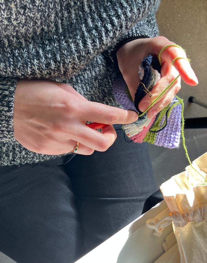 Ich habe im letzten Jahr begonnen, meine Häkelprojekte häufig mitzunehmen, wenn ich unterwegs war, weil es etwas ist, das ich wunderbar nebenher machen kann. Mir hilft es auch beim Zuhören und ich kann mich dann besser konzentrieren. Es ist total schön zu sehen, wie Menschen darauf reagieren, es ist ein absolut guter Conversation-Starter. Leute fühlen sich eingeladen, auf eine*n zuzukommen und Fragen zu stellen. Gleichzeitig ist mir aufgefallen, dass ich nicht die einzige bin, die das macht. Letztens war ich bei einer Konferenz und bin zufällig neben zwei Personen gesessen, die gestickt haben. Ich finde, man sollte das viel öfter in den öffentlichen Raum holen und sichtbar machen. Denn meistens arbeiten wir alleine zuhause an unseren Projekten, und es passiert sehr wenig Austausch und Sichtbarkeit von dem, was wir da machen. Das ist sehr schade.
