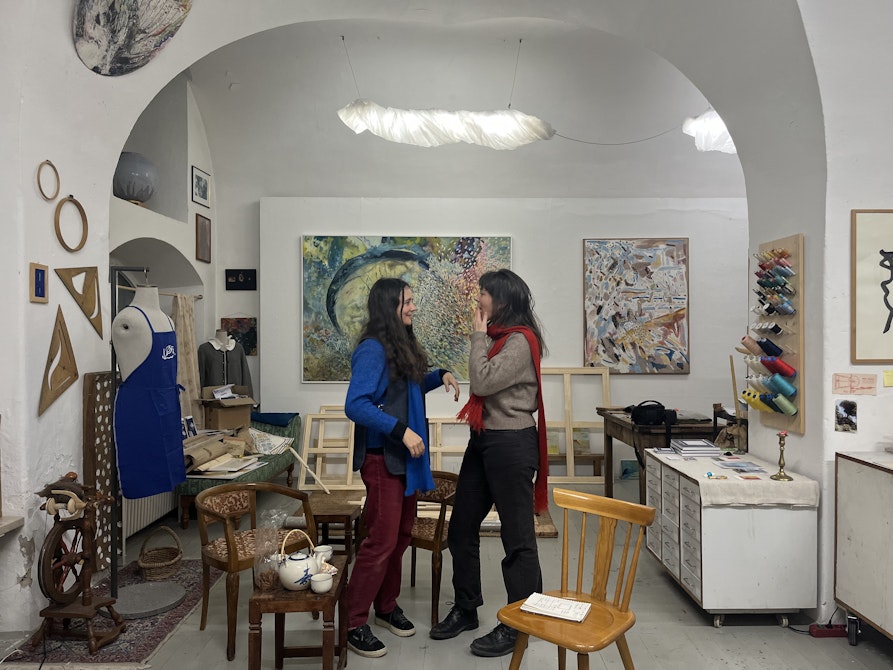 Ad accomunarle l’anno di nascita, il 1995, e la passione comune per il saper fare manuale e l’artigianalità. Eppure Laura Pan e Adele Buffa hanno una formazione e un retroterra apparentemente lontani. Bolzanina e con una formazione artistica la prima, designer torinese la seconda. Nella sua pratica artistica, Laura intreccia memoria personale, corpo femminile e pratiche legate alla trasmissione dei saperi antichi. Adele, invece, attraverso la sua ricerca e la riparazione tessile artistica, esplora e reinterpreta tecniche ancestrali come il ricamo e il rammendo. Diverse ma simili, hanno saputo trovare un punto di incontro comune, affascinate dalle tradizioni che, attraverso la pratica artistica, diventano eredità e concime per un futuro più ricco e consapevole. Dallo scorso Ottobre condividono l’Atelier di Via Weggenstein 12, trasformatosi in un luogo di confronto, convivialità e progettualità condivisa. Qui materiali e processi si intrecciano in modo spontaneo e le diverse tecniche dialogano e si contaminano. Laura e Adele si raccontano in questa intervista doppia, raccontandoci non solo dei loro progetti artistici, ma anche dello stato attuale della scena creativa locale e sui bisogni dei giovani artisti.
