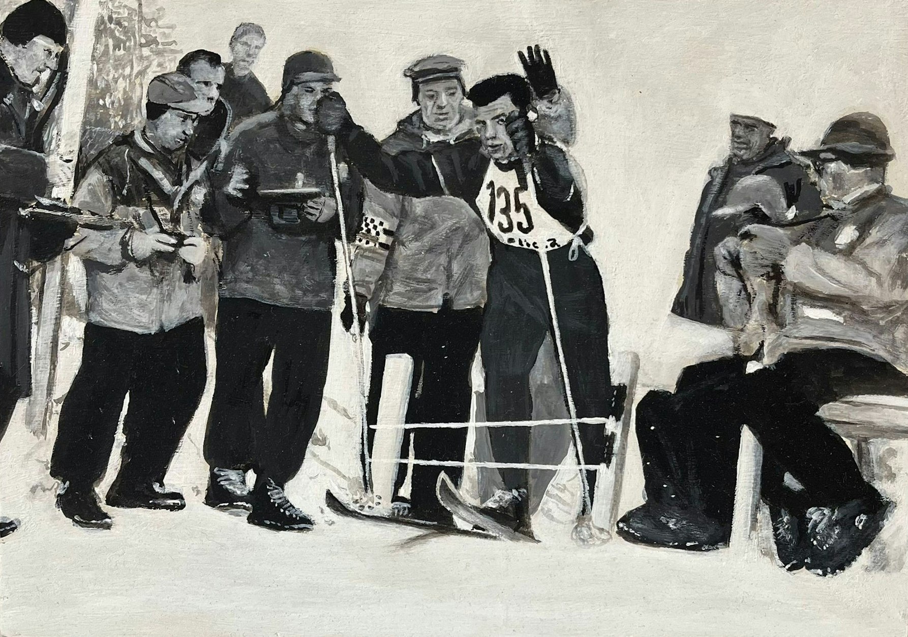 In Let it Snow questa visione si traduce in una serie inedita di opere dedicate agli sport invernali, tra paesaggi innevati, atleti sospesi e figure che sembrano emergere e subito scomparire nel bianco. Il riferimento alle Olimpiadi non ha nulla di retorico, ma diventa occasione per rileggere i grandi miti sportivi del passato e per affiancarli a immagini del presente, mettendo in dialogo la memoria collettiva con quella personale. Accanto alle grandi imprese, infatti, compaiono piccoli frammenti di quotidianità condivisa in montagna, come pagine strappate a vecchi album fotografici, fino a includere una serie più intima dedicata agli anonimi eroi di ogni giorno.