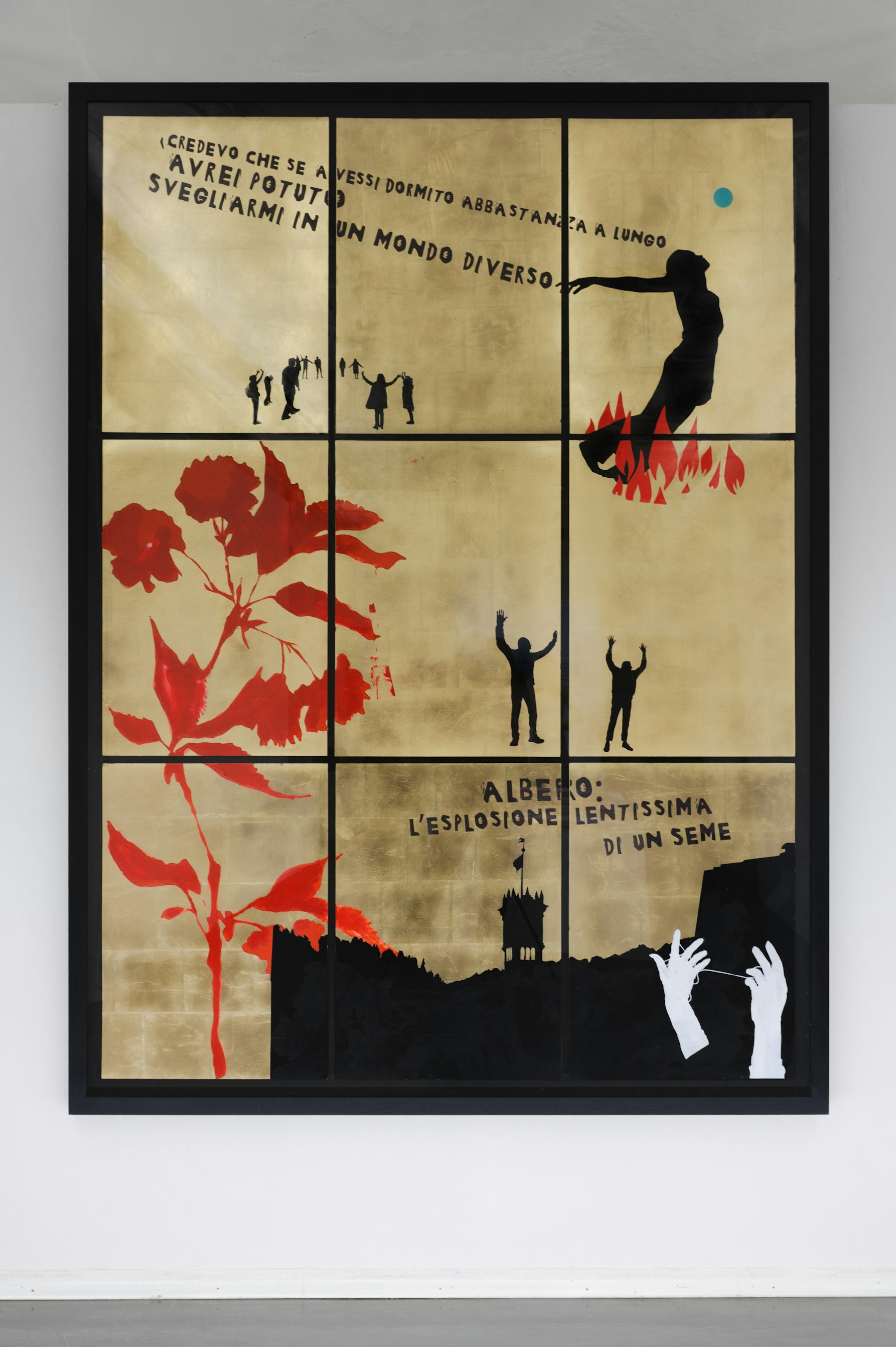 Il progetto nasce da un tempo condiviso con la comunità. Nell’autunno scorso, l’artista ha incontrato bambine, bambini, persone adulte e più anziane in due workshop che hanno messo al centro il senso di comunità come pratica quotidiana e come possibilità di trasformazione. La curatrice descrive questo passaggio come un processo in cui la partecipazione diventa allo stesso tempo cammino ed esito, capace di attivare un potere di emancipazione sia individuale che collettivo. Da questi scambi -fatti di pensieri, suggestioni, motti e immagini- prende forma un nuovo lavoro di Senatore: un collage in nove elementi, posto al cuore della mostra per “raggiungere chiunque”.