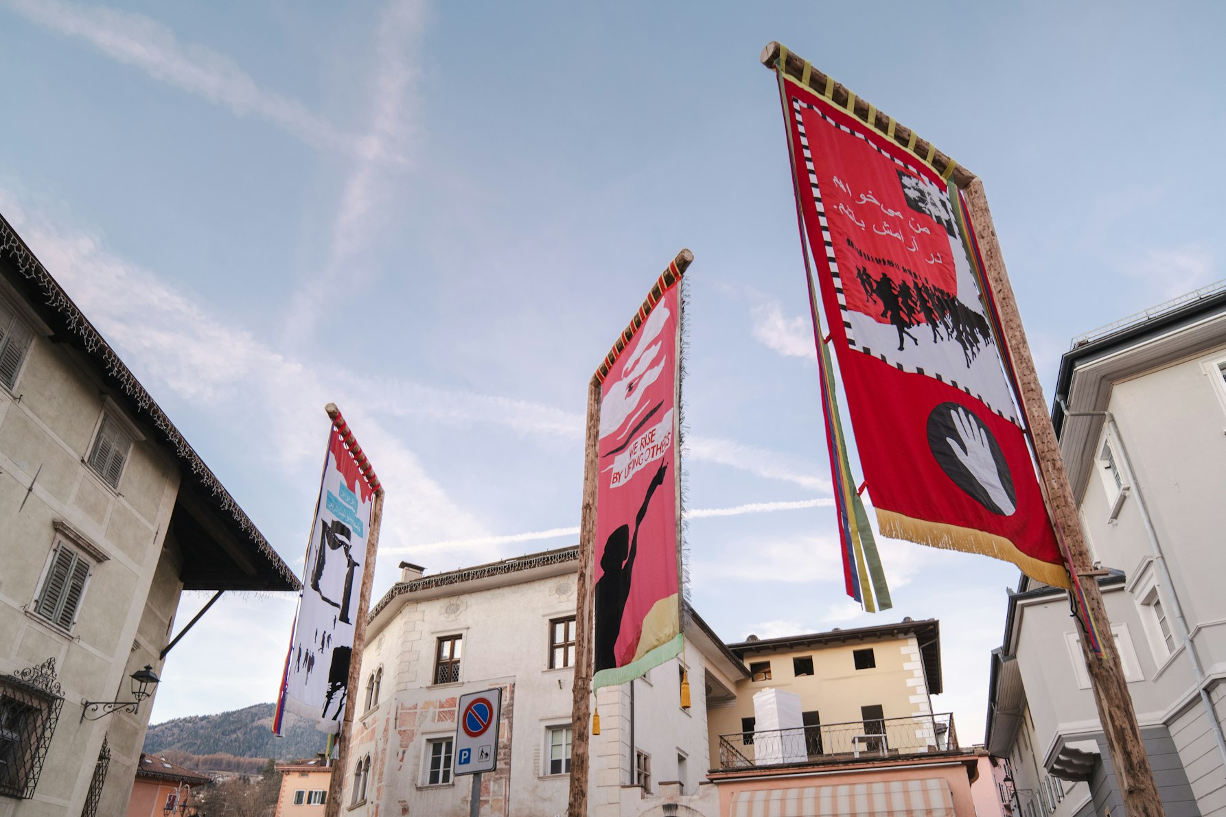 In Piazzetta Rizzoli 1, i grandi drappi tessili di I Contain Multitudes ampliano ulteriormente questa idea di spazio condiviso, trasformando un luogo di passaggio in una sorta di agorà sensibile. Le superfici morbide e monumentali evocano gonfaloni, manifesti sindacali, tessuti artigianali: segni di una storia fatta di mani, di lavoro, di corpi che si sono riconosciuti in simboli comuni. «I drappi, con la loro monumentalità morbida, non impongono ma avvolgono; sono fatti per ospitare, per raccogliere gli sguardi e i passaggi: gonfaloni processionali, stendardi di rivendicazione, strisce di stoffa lavorate nelle cucine e nelle botteghe, dove la manualità è sempre stata un gesto politico e affettivo allo stesso tempo. Tradizioni come quelle dei gonfaloni o dei manifesti sindacali parlano di partecipazione, di corpi che si muovono insieme e si riconoscono in un simbolo collettivo. Pur trasformati, quei codici entrano nei drappi come echi e come possibilità: li caricano di un’energia comunitaria che non appartiene a un singolo, ma a una moltitudine di gesti, di conflitti, di speranze. In questo senso, i tessuti ampliano la partecipazione perché invitano chi li osserva a ritrovare il proprio posto nella trama collettiva: non come spettatore, ma come co-autore silenzioso di un’eredità in movimento. È così che la memoria, lontano dall’essere un archivio immobile, si fa pratica condivisa, un organismo vivo che respira con la comunità e che le storie si portano, si sollevano, si intrecciano. Insieme».