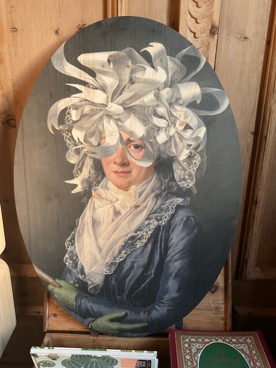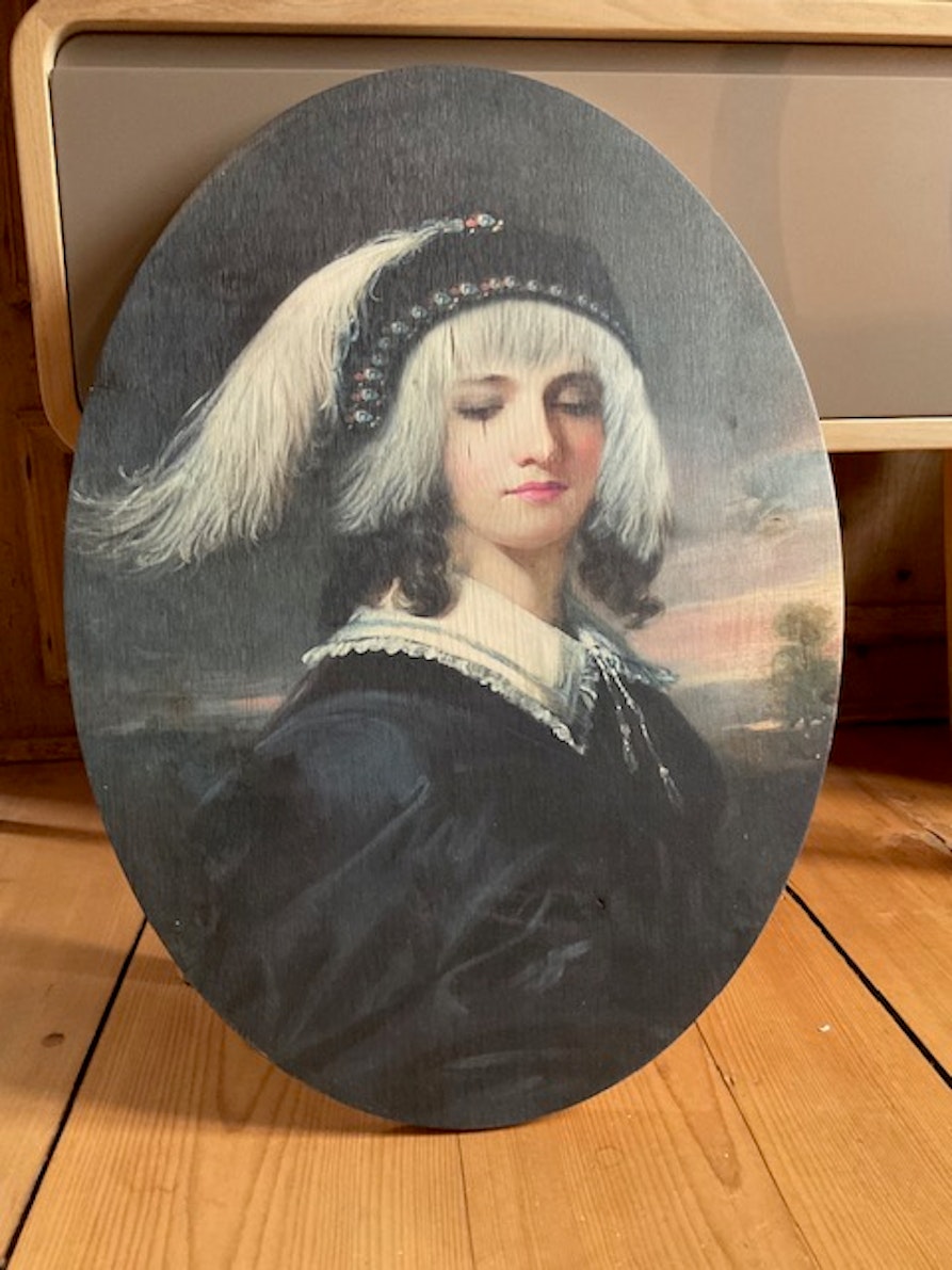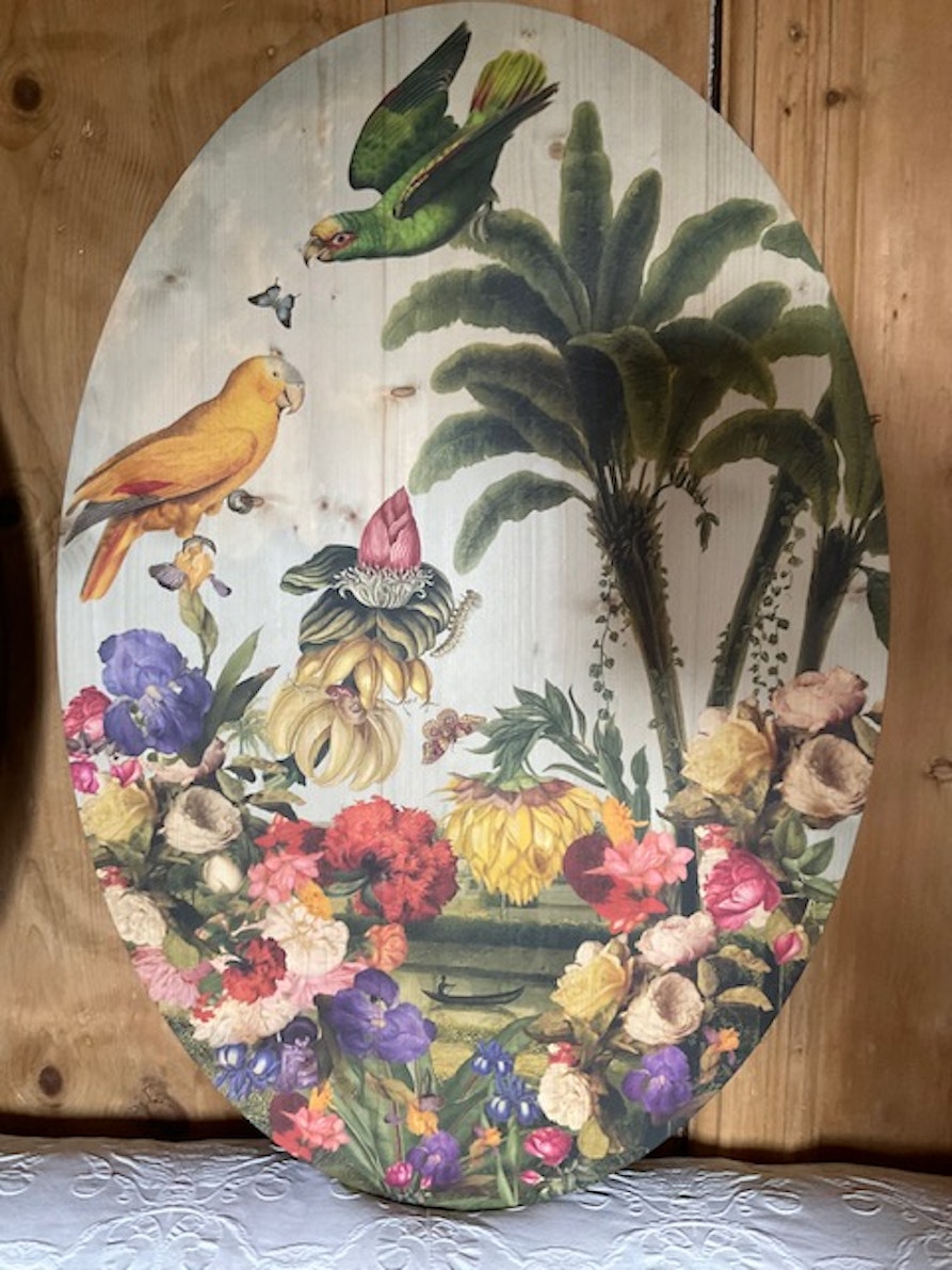 Uno dei progetti recenti che mi ha appassionato di più è quello realizzato per l’Hotel Schloss Freudenstein ad Appiano, che ha sede in un castello molto antico, con parti risalenti al XIII secolo. Per questo luogo, così carico di storia, ho creato una serie di tavole in legno decorate, sviluppando un lavoro digitale composto da elementi dipinti a mano e poi digitalizzati. Ne sono nate vere e proprie storie visive: personaggi sospesi in mondi esotici, circondati da palme, pappagalli, fiori e frutti, spesso con un castello immerso nella natura lussureggiante sullo sfondo. Amo molto l’illustrazione del passato e ho costruito via via un mio universo visivo, molto colorato ed evocativo. Le venature del legno sono parte integrante dell’opera: ogni immagine è stata scelta in dialogo con ciò che ho intravisto nella materia, perché le linee naturali del legno possono cambiare completamente l’espressione dei volti e l’atmosfera della scena. Sono tavole in cui i personaggi sembrano abitare una dimensione sospesa, che attraversa il tempo, tra memoria e sogno.