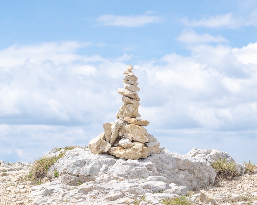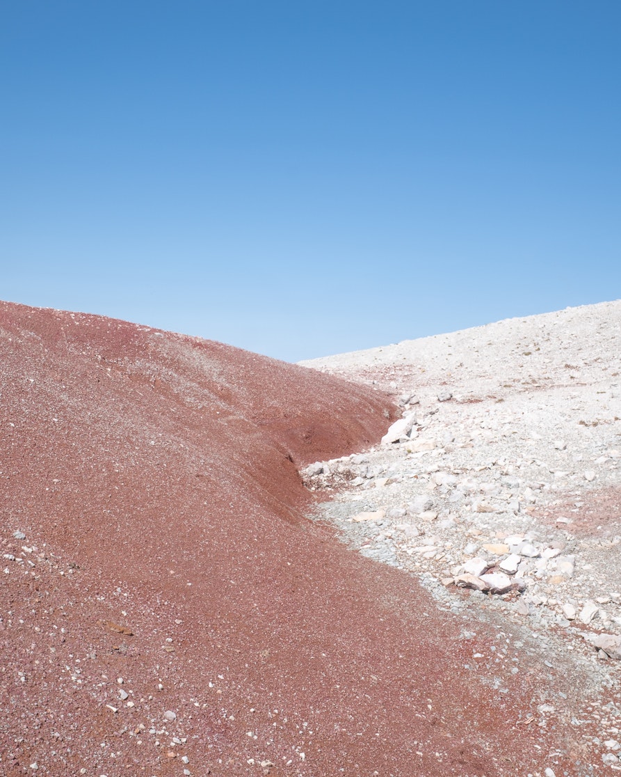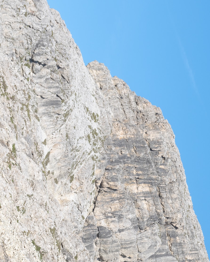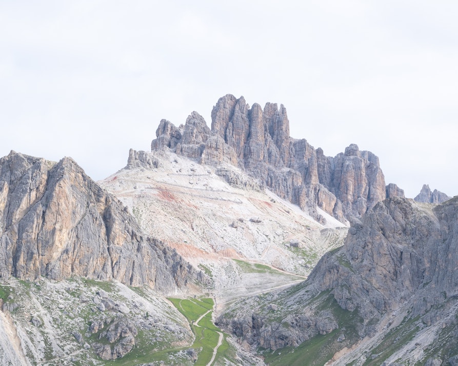 Ci sono due immagini molto forti che per me rappresentano il battito d’inizio e di fine di questo racconto. La prima rimanda alla genesi stessa del progetto ed è una composizione di pietre in equilibrio, una di quelle "montagnole" che gli escursionisti costruiscono lungo i sentieri. Volevo che rappresentasse l'essenza stessa della montagna: un equilibrio fragile fatto di tanti singoli elementi che, insieme, creano la maestosità del tutto. L’ultima foto invece è la montagna in sé, il Lagazuoi nella sua interezza, un’immagine che chiude il cerchio. Visivamente sono scatti molto diversi: la prima è un primo piano stretto, un quattroquinti orizzontale in cui i sassi, tra il grigio e un bianco che vira al giallognolo, si stagliano contro un cielo in bilico tra l’azzurro e il nuvoloso. L’ultima è invece un paesaggio puro, un orizzonte dominato da un cielo plumbeo, bianco e denso. Abbiamo vissuto giorni di meteo difficile, ma quel grigio ha reso tutto magico: in quell'ultima foto si ritrovano tutti gli elementi che avevo analizzato singolarmente, dalla sabbia rossa ai prati fino alla nuda roccia.