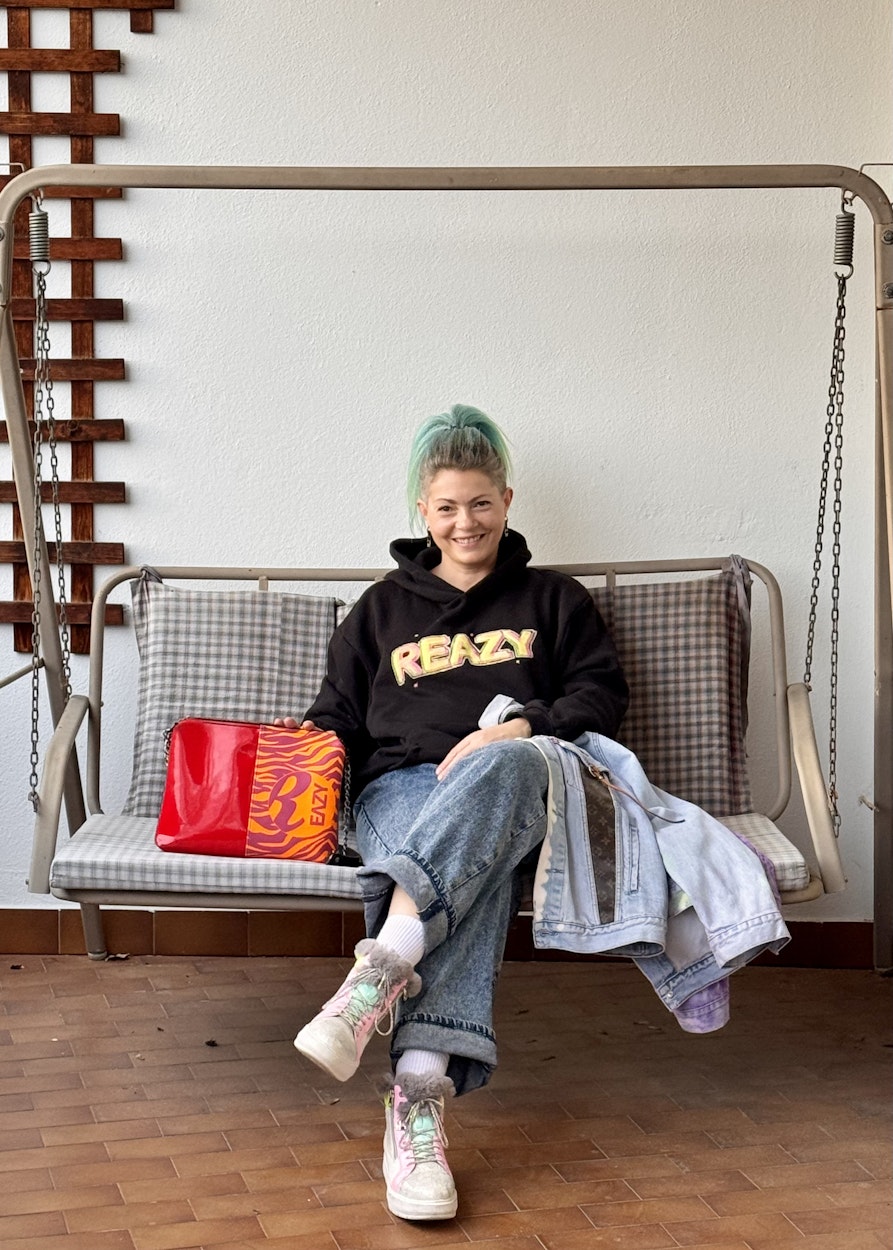 Gestartet bin ich mit Taschen. Ich suchte nach einer praktischen Schwimmtasche für meinen Sohn und, da nichts Passendes zu finden war, habe ich eine entworfen. Diese Schwimmtaschen haben sich sehr gut verkauft. Es war mir von Anfang an wichtig, auf Qualität zu setzen. Die Taschen, die ich vor zehn Jahren gemacht habe, sind immer noch im Umlauf. Sie sind aus sehr guten Materialien gefertigt und hochwertig verarbeitet – wirklich langlebig. Im Lauf der Zeit haben sich viele Materialien angesammelt und die Kund*innen konnten sich genau die Tasche machen lassen, die sie wollten. Kleidung ist irgendwann dazugekommen. Ich hatte so viel zuhause und begonnen, die Stücke, vor allem Jacken, zu bemalen und zu bekleben. Ich habe ein riesiges Arsenal an Ketten, Schließen, Lederriemen, Stoffen … Daraus schöpfe ich. Sieben Jahre führte ich mein Atelier in Klausen, heute mache ich REAZY.design nebenbei und auf Anfrage.