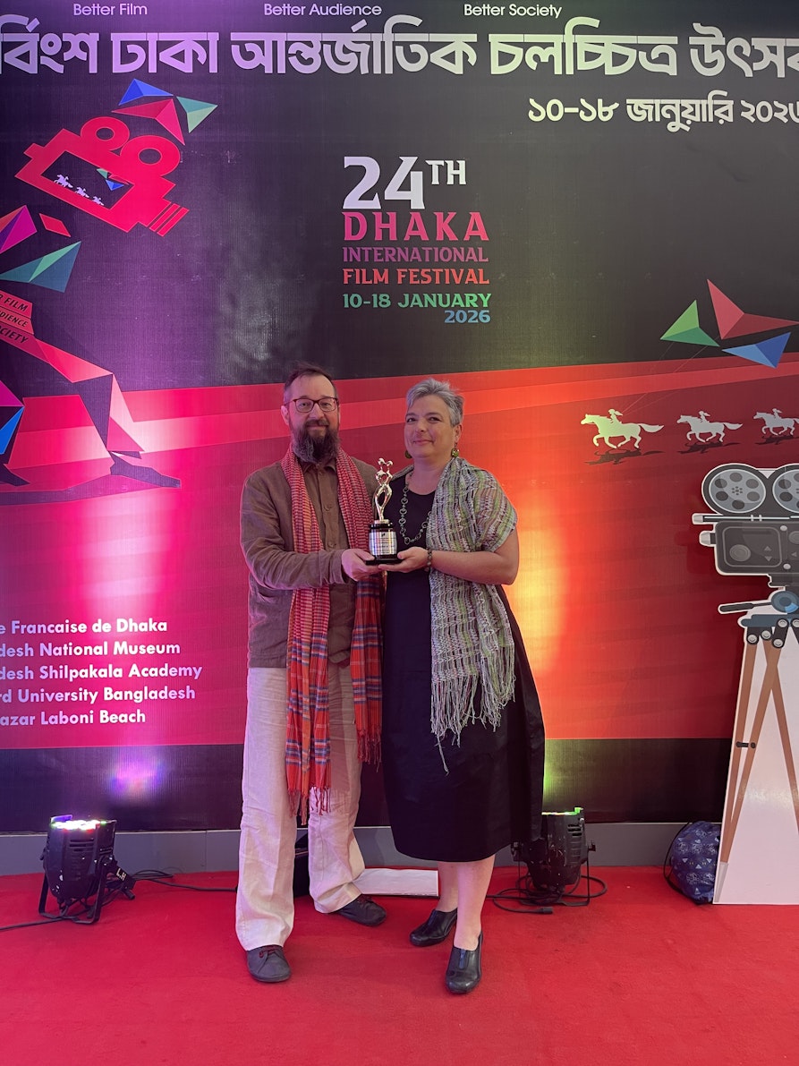 The Guardian of Stories wurde auf sieben internationalen Festivals in China, Australien, Bangladesch, Nepal, Kambodscha, den USA und Italien gezeigt. Für uns liegt der Erfolg dieses Films in seiner hybriden Natur, die verschiedene künstlerische Ausdrucksformen miteinander verbindet. Es ist ein Dokumentarfilm, der nicht nur beobachtet, sondern sich in ein visuelles und poetisches Erlebnis verwandelt. Ein Film, der durch seine Fähigkeit beeindruckt, dokumentarischen Realismus mit theatralischer Magie zu verbinden. Wir haben zwei vollständige Geschichten, die wir gemeinsam mit Siphai in den Dörfern gesammelt haben, mithilfe des Figurentheaters im Film integriert, um so das Publikum in eine märchenhafte, fast traumartige Dimension zu versetzen. Uns war es wichtig, nicht nur die Realität zu zeigen, sondern die Zuschauer:innen in die imaginären Welten laotischer Volksmythen eintauchen lassen, in denen Mythologie, Landschaft und Alltag miteinander verwoben sind. Genau das ist es, was auch dem Publikum gefällt: ein Film, der evoziert, nicht nur erzählt. Und dann ist da der Rhythmus – kontemplativ, langsam, respektvoll – der das Leben in Laos widerspiegelt, wo Zeit anders zu verlaufen scheint. Diese Atmosphäre hat jede Einstellung, jede Stille und jede Übergangsszene geprägt. Die Bilder und die Fotografie sind nicht nur unterstützend, sondern bewusst gestaltet, um Emotionen zu vermitteln und die Zuschauer:innen in diese Welt eintauchen zu lassen. Es ist eine poetische, aber auch positive Geschichte: kein bloßes Dokument, sondern eine Hymne auf die Widerstandskraft kultureller Traditionen und die Schönheit des mündlichen Erzählens. Und vielleicht ist es in einer Zeit technologischer Hektik genau diese erzählerische Ruhe, dieses Vertrauen in die Kraft von Bildern und Worten, die Menschen am meisten berühren. Außerdem verbinden erzählte Geschichten Menschen – unabhängig von Herkunft, Kultur oder Alter. Besonders deutlich wurde uns das bei den beiden Festivals in Asien, bei denen wir vor Ort waren. In den Gesprächen mit dem Publikum in Shanghai (China) und Dhaka (Bangladesch) tauschten wir uns über ihre eigenen Geschichten und Erzähltraditionen aus. Dabei wurde uns bewusst, wie universell das Bedürfnis nach Geschichten ist: Das Geschichtenerzählen ist ein Alleinstellungsmerkmal des Menschen: Nur wir Menschen erzählen einander Geschichten, um Erfahrungen zu teilen, Erinnerungen weiterzugeben und Verbindung zu schaffen.