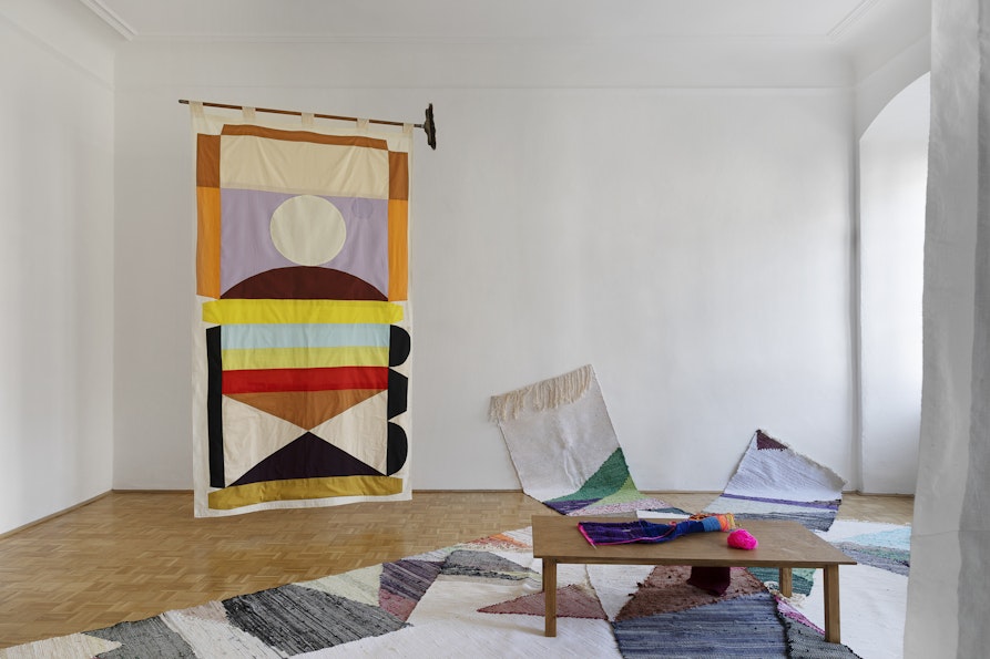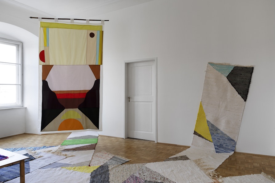 In den verschiedenen Räumen der Ausstellung gewähren die dynamischen Werke einen wunderbaren Einblick in den Prozess, durch den Isabel Peterhans und Lea Abendstein sich Schritt für Schritt künstlerisch näher gekommen sind. Einen möglichen Abschluss für den Ausstellungsrundgang bildet die Installation Rest to Gather: Aus Stoffresten wurden hier Teppiche gewebt und Banner kreiert, die dazu einladen, über das Thema Zuhause nachzudenken. Zuhause als Ort, an dem man sich selbst begegnet oder mit lieben Menschen zusammen kommt. Aber auch als Ort, an dem man abgetrennt von der Gesellschaft ist. Hier können die Besucher:innen sich selbst einbringen, indem sie an einem kollektiven Strickwerk mitwirken und so dazu beitragen, Nähe und Verbundenheit zu schaffen. Wie Isabel Peterhans und Lea Abendstein selbst durch die Entwicklung dieser Ausstellung ein neues Miteinander entworfen haben, erzählen sie im folgenden Gespräch.
