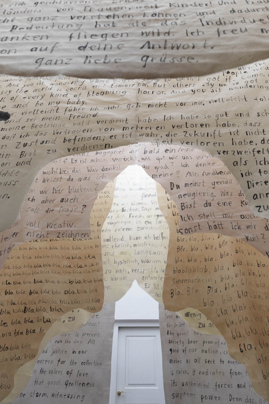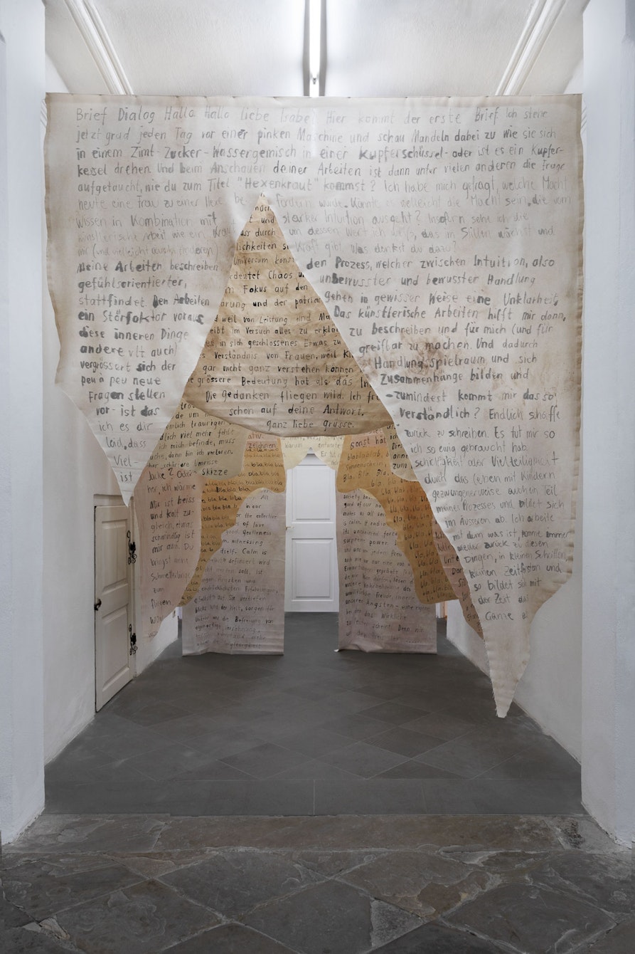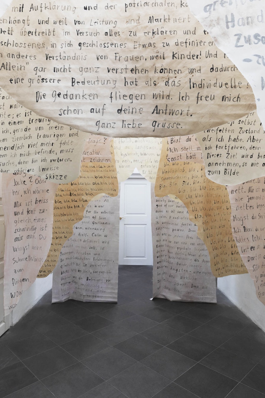 In Flirt kann das Publikum den spielerischen Prozess nachverfolgen, in dem sich die beiden Künstlerinnen auf kreative Art begegnet sind. Der E-Mail-Austausch, mit dem alles begann, verwandelte sich schließlich in ein gemeinsames Kunstprojekt. Die Besucher:innen können die Ausstellung durch eine Installation mit Textfragmenten aus feministischen und philosophischen Lektüren und der E-Mail-Korrespondenz zwischen den Künstlerinnen betreten. „Die Gedanken fliegen wild. Ich freu mich schon auf deine Antwort“, ist da zu lesen. Dieser Ausschnitt vermittelt einen guten Eindruck davon, wie sich die Ausstellung entwickelt. Sie ist wie ein lebendiger Austausch, bei dem Ideen, Materialien, verschiedene An- und Aussichten miteinander in Dialog treten. Die unterschiedlichen Hintergründe der beiden Künstlerinnen spiegeln sich teils in den Kunstwerken, die auch viele Gemeinsamkeiten aufweisen.