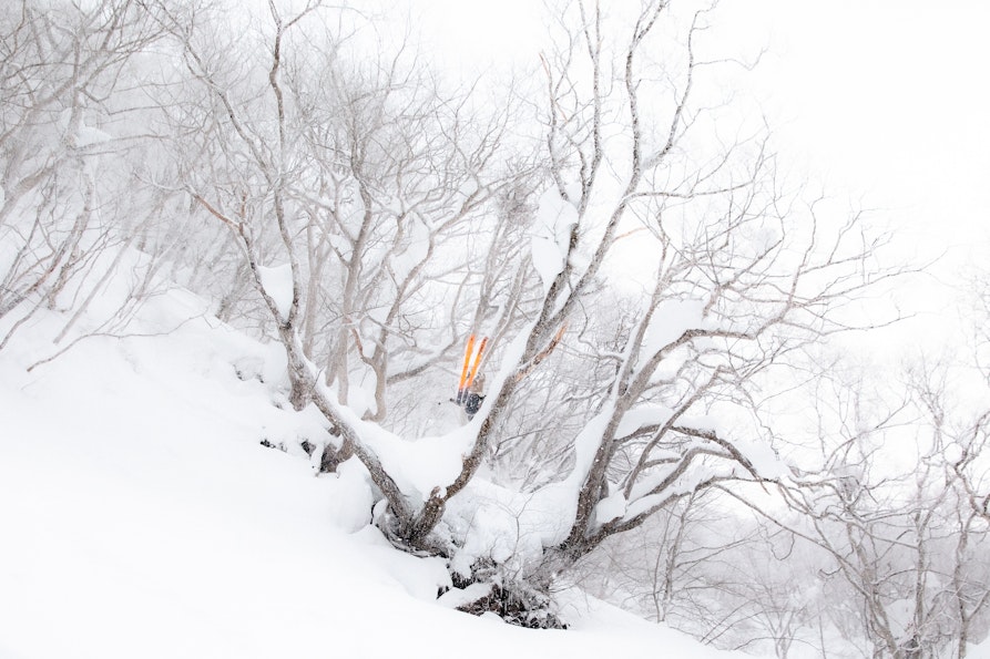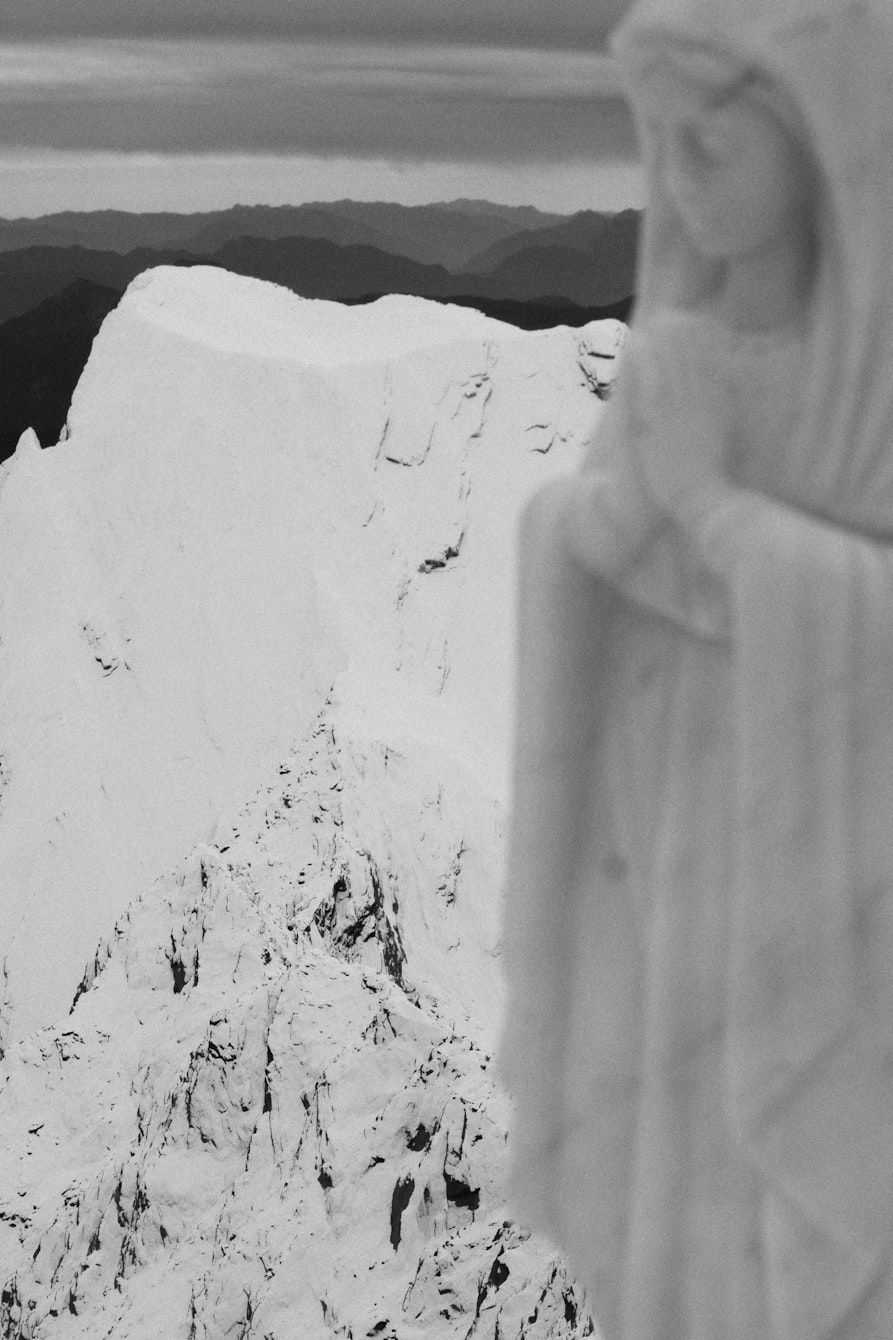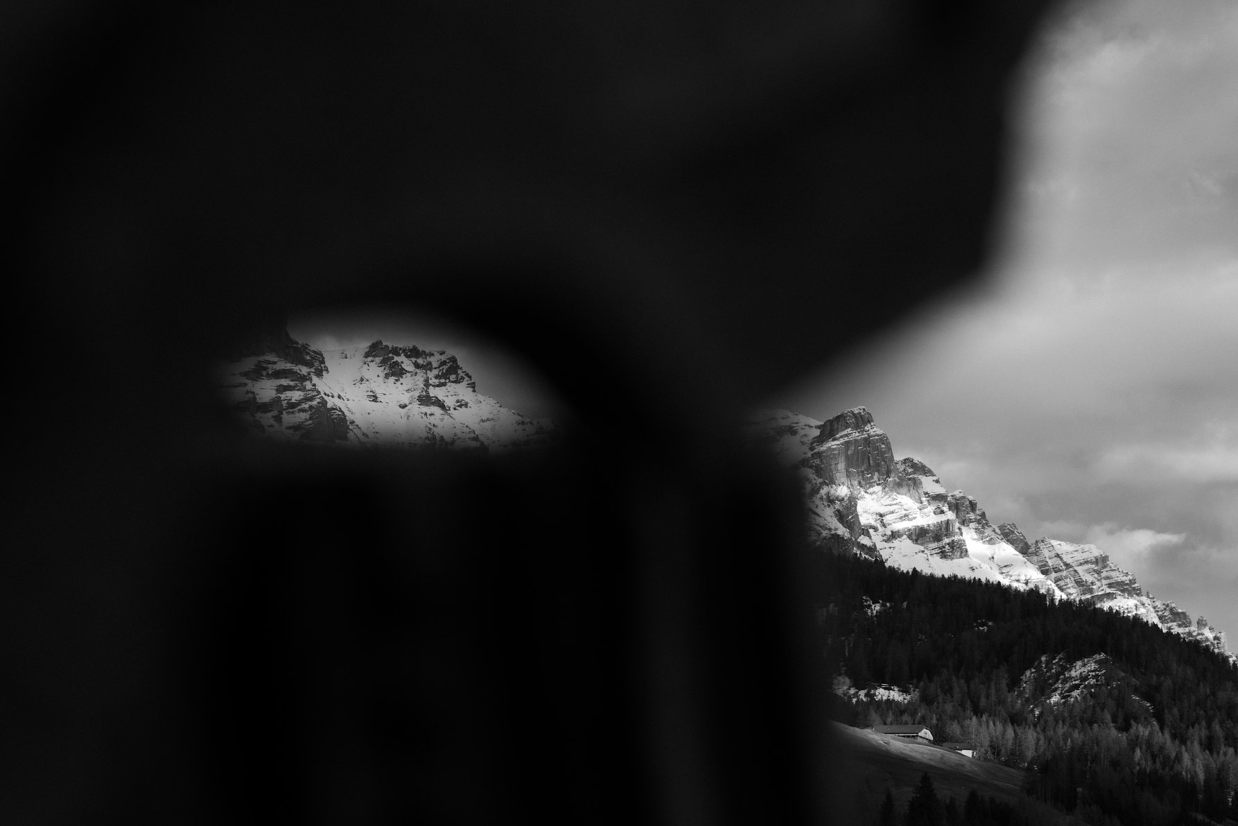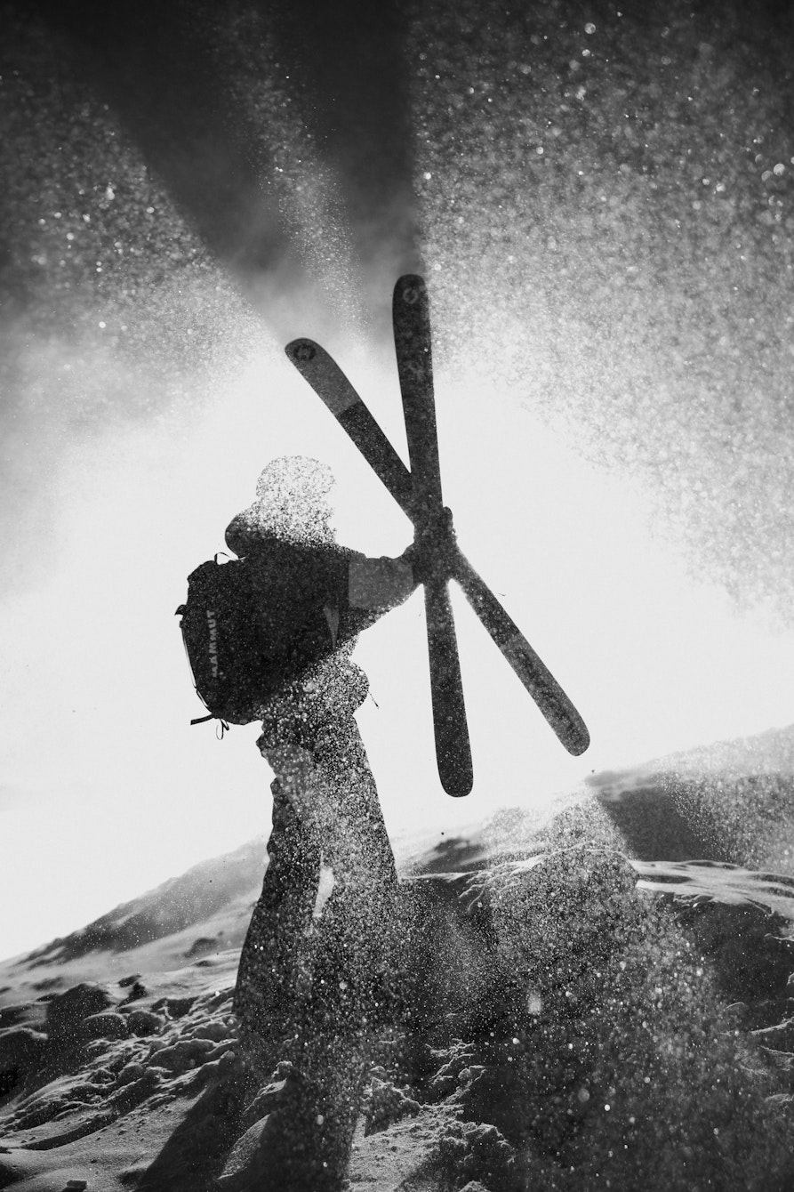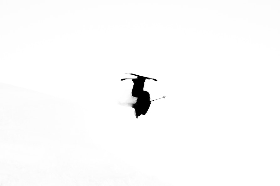 La prima è uno scatto realizzato vicino all'Alpe di Siusi da una vecchia casetta sommersa da oggetti. Ho scattato attraverso un'apertura: quasi tre quarti dell'immagine sono totalmente neri, un buco oscuro da cui emergono le Dolomiti sullo sfondo. È un'immagine di puro focus. All'opposto c'è una foto scattata a Courmayeur: un mio amico che esegue un backflip con gli sci. Lì c'è solo lui, una silhouette nera sospesa nel bianco assoluto del cielo. Rappresentano i miei due poli: la montagna che ci osserva da lontano e l'essere umano che la sfida attraverso lo sport.