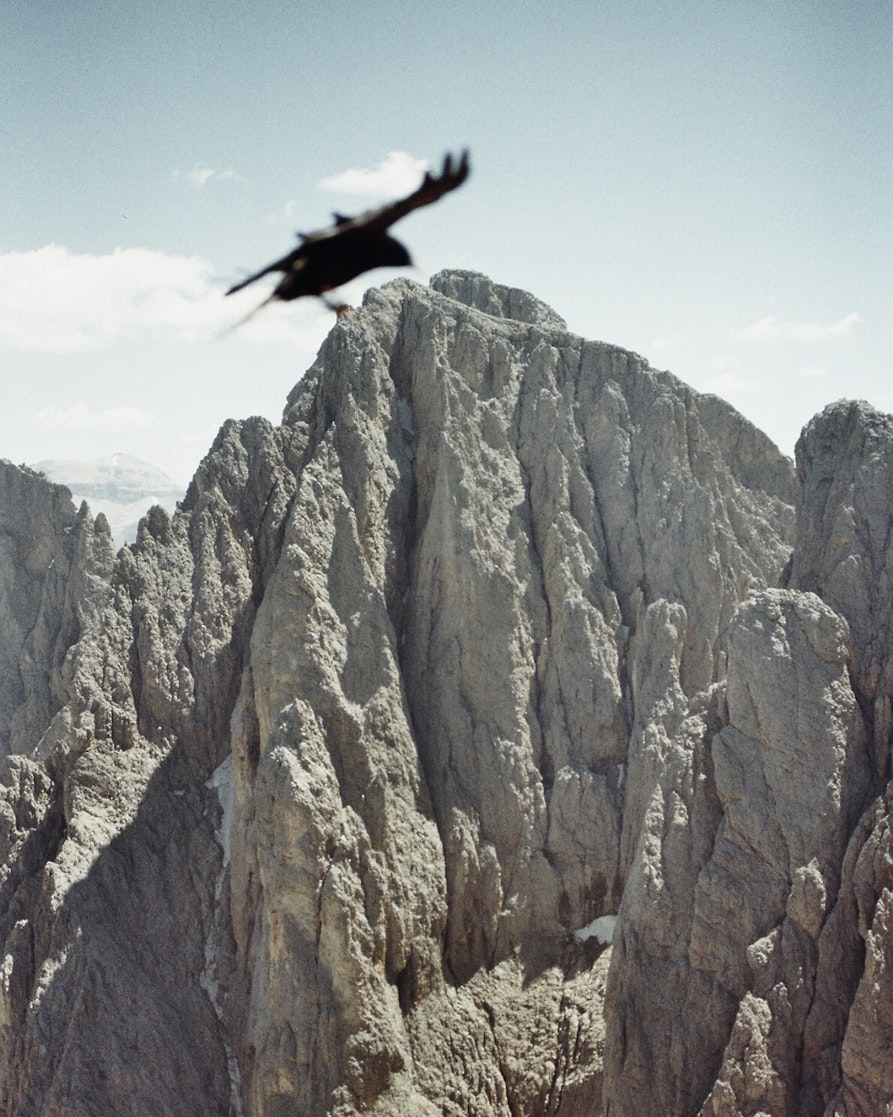 Una fotografia analogica del 2019 realizzata sulla cima del Sassopiatto. Volevo inquadrare il Sassolungo e, proprio nell'istante dello scatto, una gracchia alpina ha attraversato l'inquadratura. Sviluppando il rullino, ho scoperto che per un gioco ottico l'uccello sembrava posato esattamente sulla cima. È un'immagine simbolica per me: rappresenta la pura fortuna e quella spontaneità che la fotografia digitale a volte rischia di soffocare. Uno scatto unico, senza post-produzione, nato dal caso.