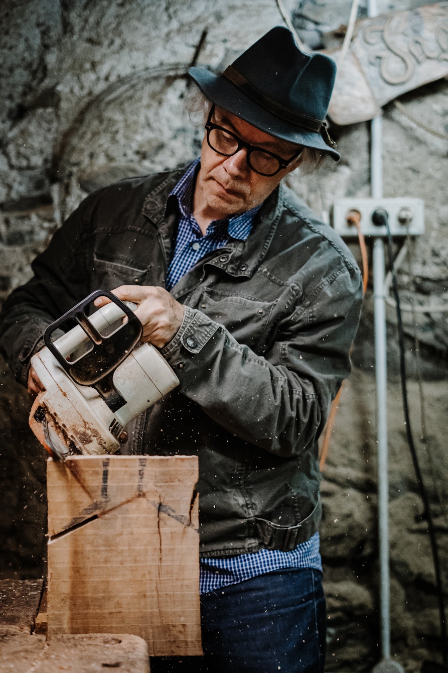 I taglieri Plun nascono dall’incontro tra arte e artigianato, tra gesto spontaneo e materia viva. Realizzati a mano libera con la motosega, ogni tagliere è scolpito da un unico blocco proveniente da un melo di 40 anni, trasformando un albero carico di storia in un oggetto d’uso quotidiano dal forte valore espressivo. Nessun pezzo è uguale all’altro: le tracce del lavoro manuale, le imperfezioni del legno, i segni del tempo si conservano sulla superficie, rendendo ogni creazione unica e irripetibile.
